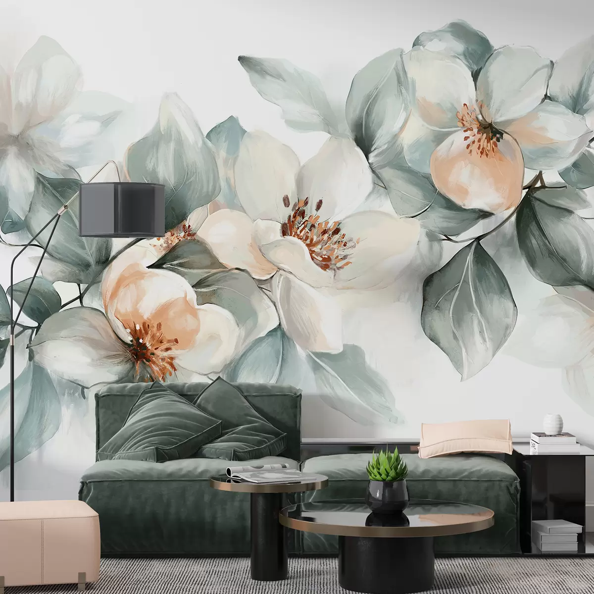 Fototapeten Zarte weiße und rosa Magnolienblüten mit weichen grünen Blättern vor einem hellen Hintergrund N° w08220