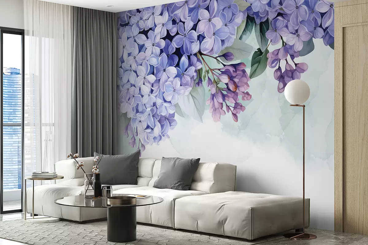 Fototapeten Leuchtend violette Hortensienblüten mit grünen Blättern, die den Rahmen vor einem weichen, unscharfen Hintergrund füllen N° w08223