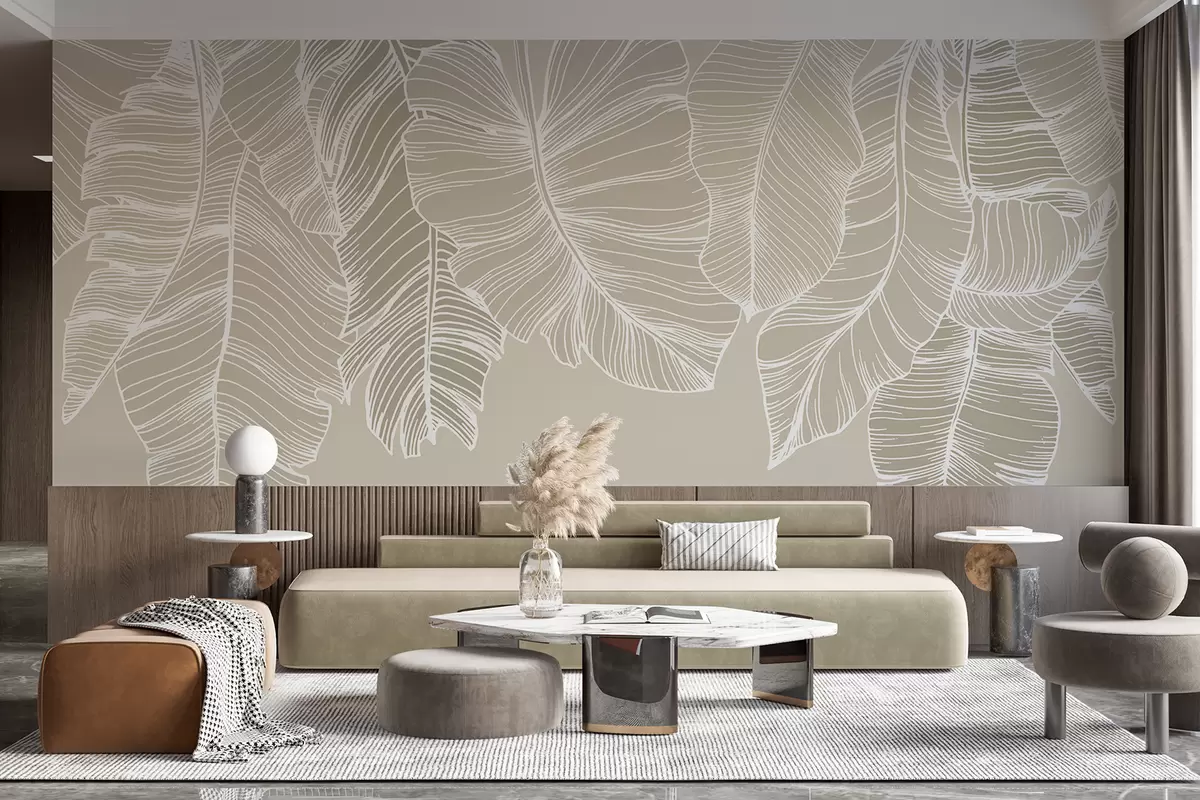 Fototapeten Weiße tropische Blumenblätter mit hellbeigem Hintergrund, minimalistisches Line-Art-Design N° w08235