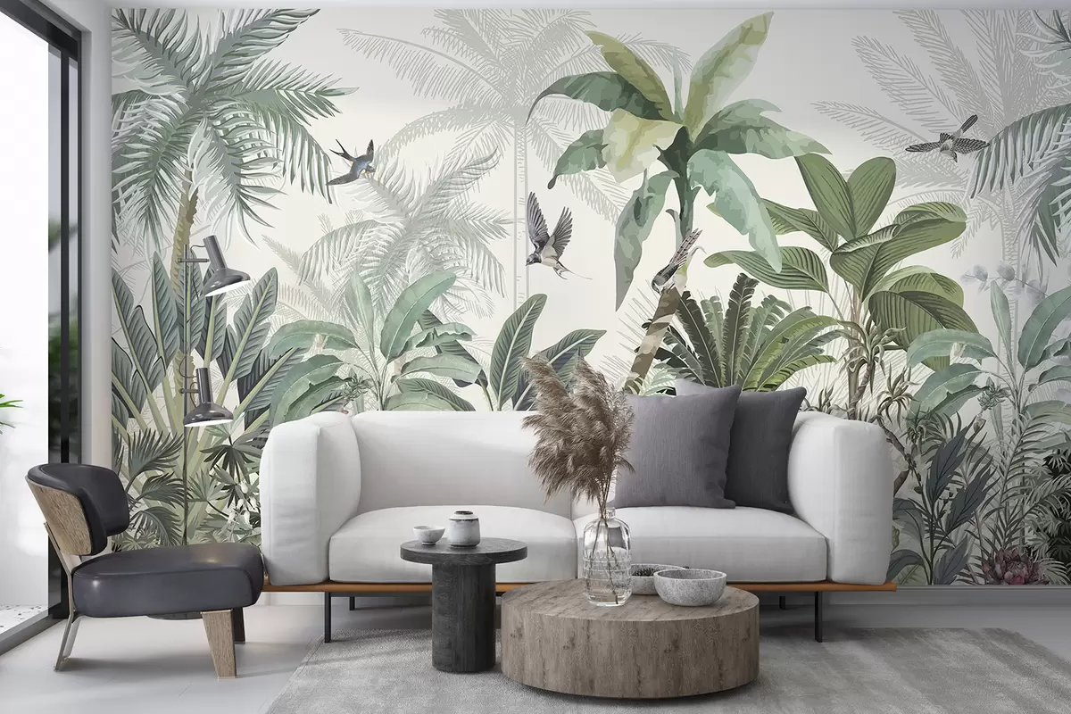 Fototapeten Eine üppige tropische Dschungelszene mit verschiedenen Palmen, großen Blättern und bunten Blumen im Vordergrund N° w08239
