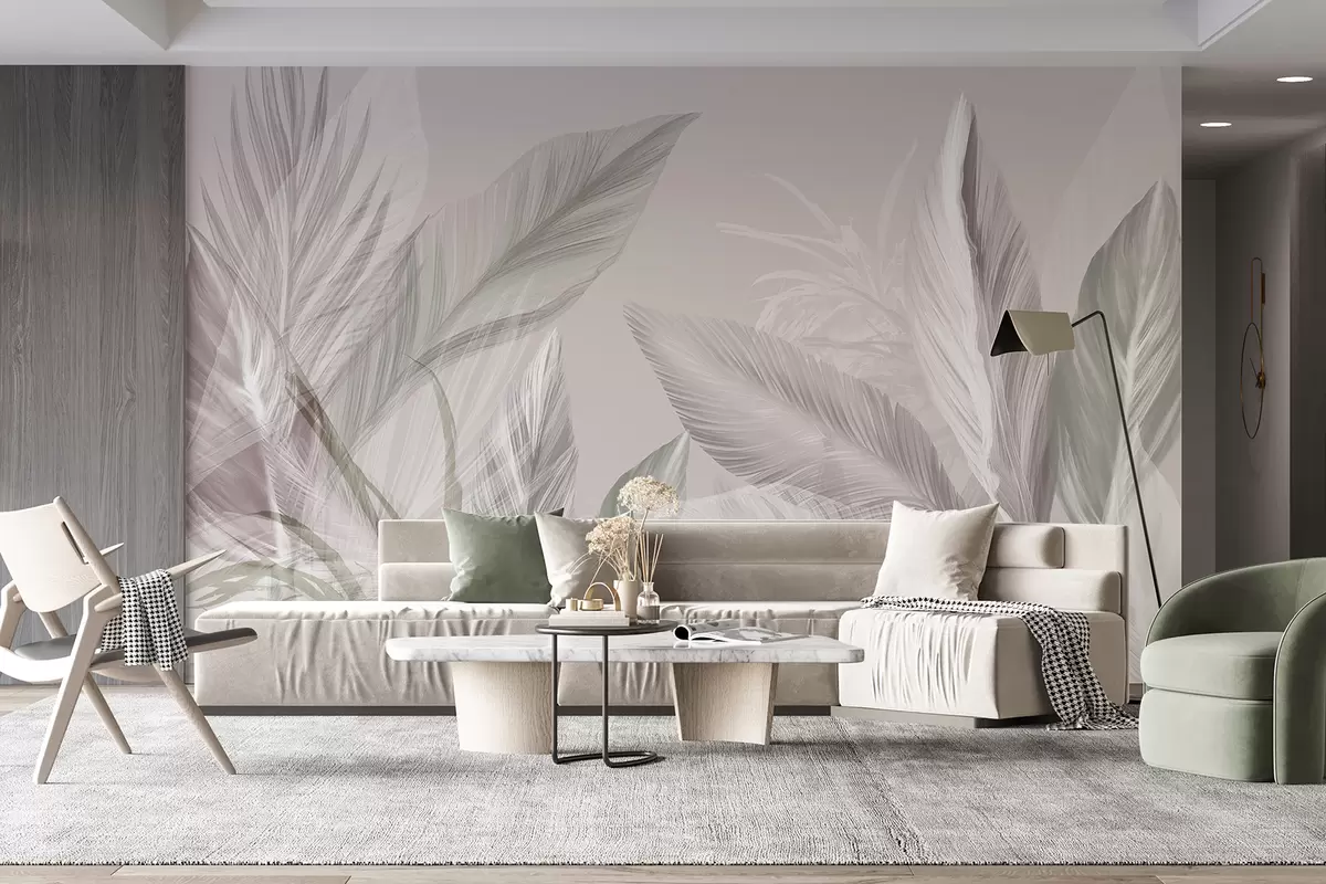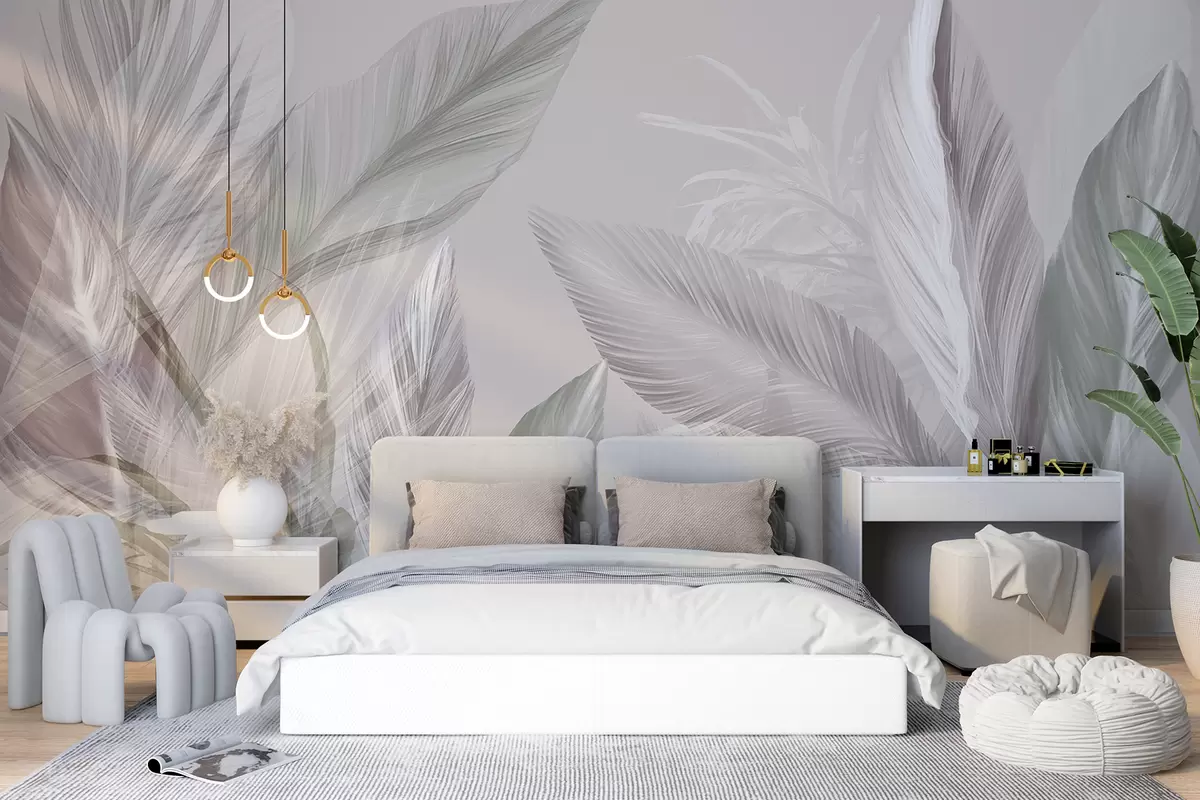 Fototapeten Weiche weiße, rosa und graue Federn und tropische Blätter schweben vor einem hellen Hintergrund N° w08241v1