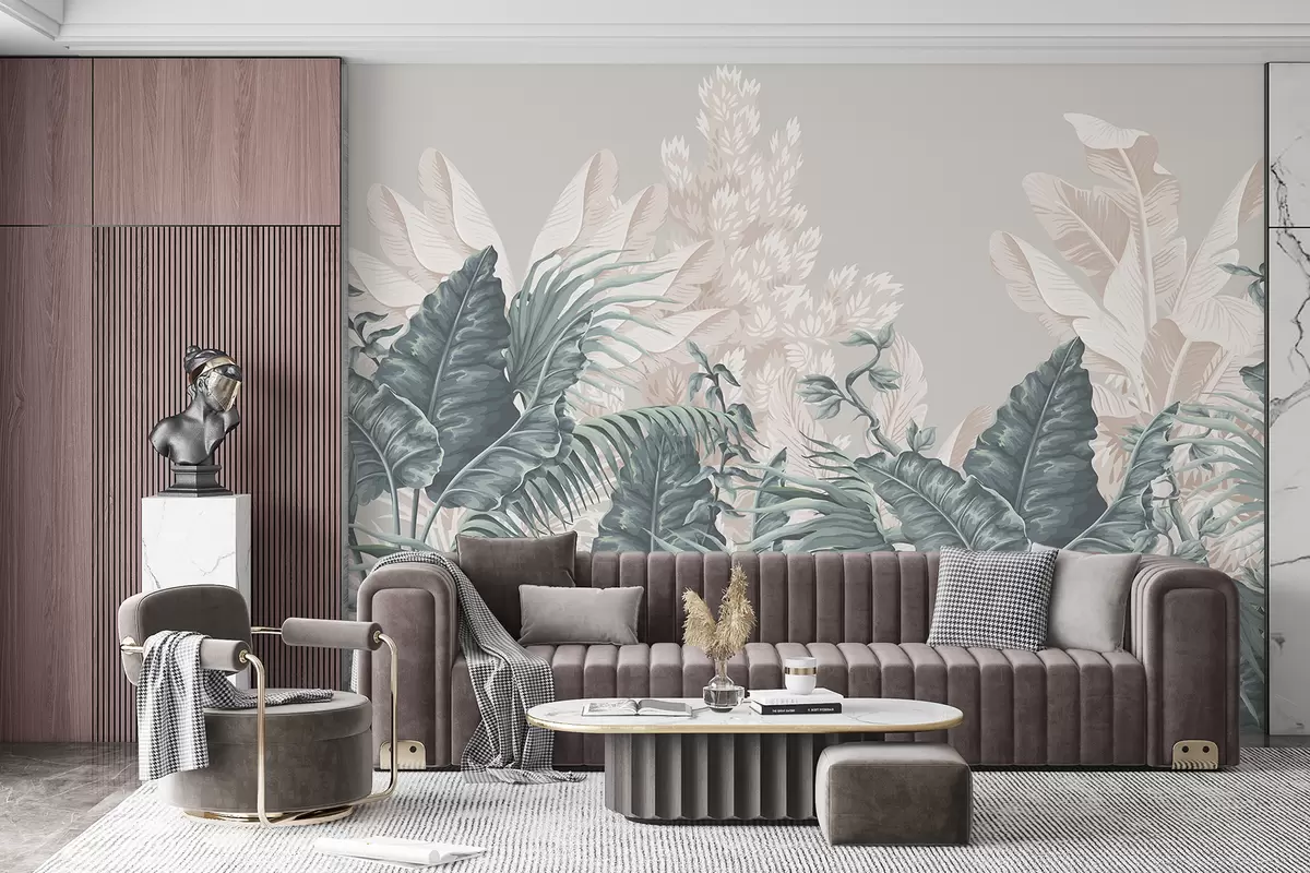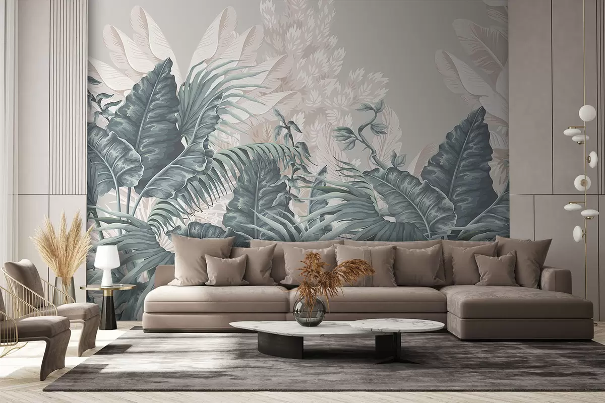 Fototapeten Eine tropische Dschungelszene mit großen grünen Blättern und Blumen im Vordergrund, die eine üppige Atmosphäre schaffen N° w08242