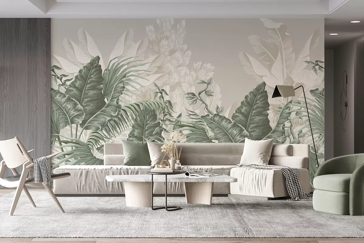 Fototapeten Eine tropische Dschungelszene mit großen grünen Blättern und Blumen im Vordergrund, die eine üppige Atmosphäre schaffen N° w08242v1