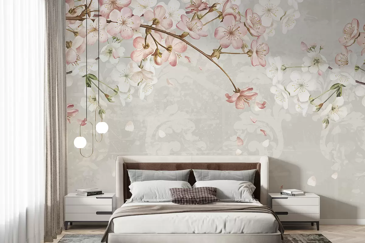 Fototapeten Rosa und weiße Kirschblüten in voller Blüte, mit weichen Blütenblättern, die auf einen strukturierten beigen Hintergrund fallen N° w08254v1