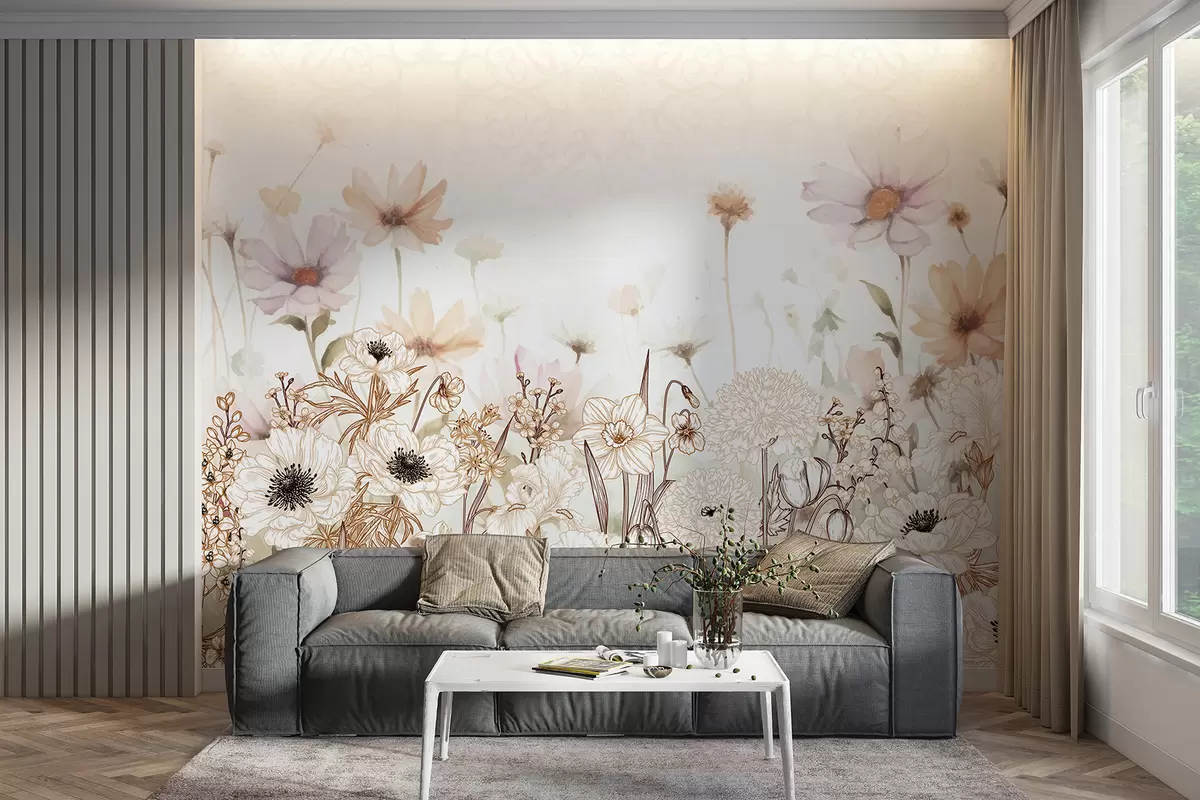 Fototapeten Ein Feld mit weißen, beigen und rosafarbenen Blumen und Blättern vor einem weichen, unscharfen floralen Hintergrund N° w08259