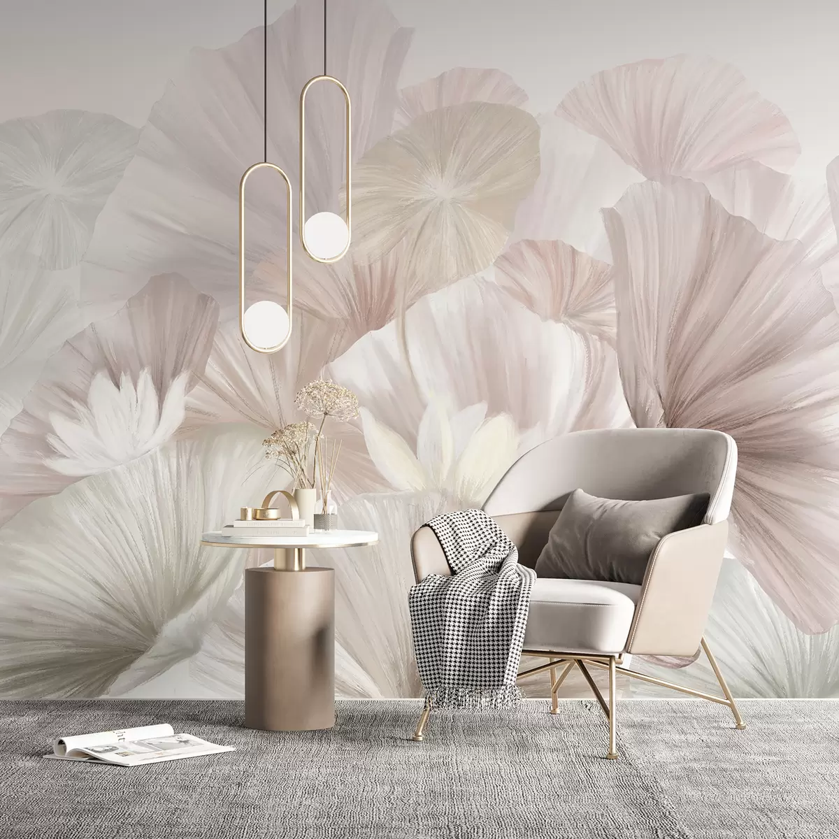 Fototapeten Zarte rosa Lotusblätter mit weißen Blüten mit weichen, federleichten Blütenblättern in einer natürlichen Kunstkomposition angeordnet N° w08265v1