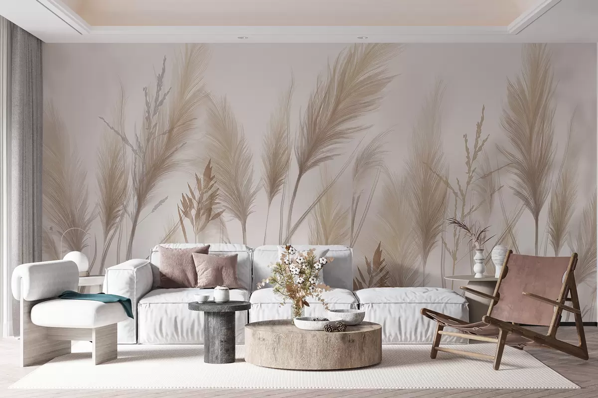 Fototapeten Hohe beige Grashalme Ährchen wiegen sich im Wind vor einem weichen, hellen Hintergrund N° w08268
