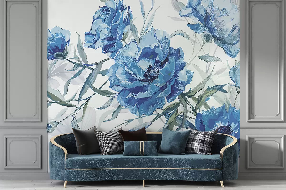 Fototapeten Blaue Pfingstrosen Gemälde mit üppigem Laub vor einem hellen abstrakten Hintergrund N° w08274v1