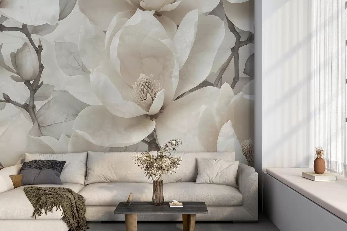 Fototapeten Weiße Magnolienblüten in voller Blüte, mit weichen, zarten Blütenblättern und einem strukturierten natürlichen Hintergrund N° w08278