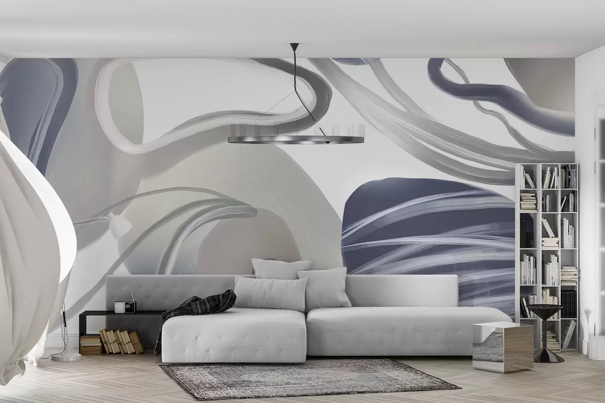 Fototapeten Abstrakte, wirbelnde Formen und Kurven in dunkelblauen Tönen, die eine dynamische und fließende Komposition ergeben N° w08279v1