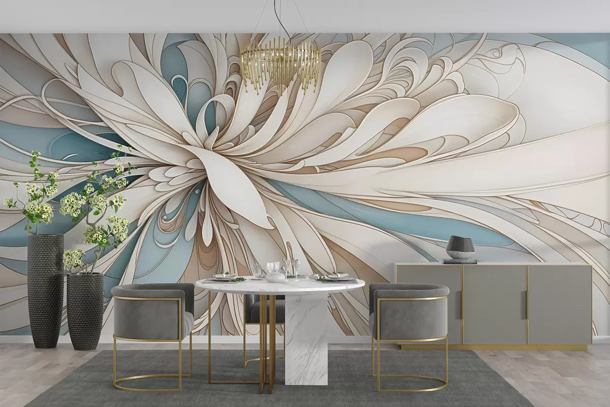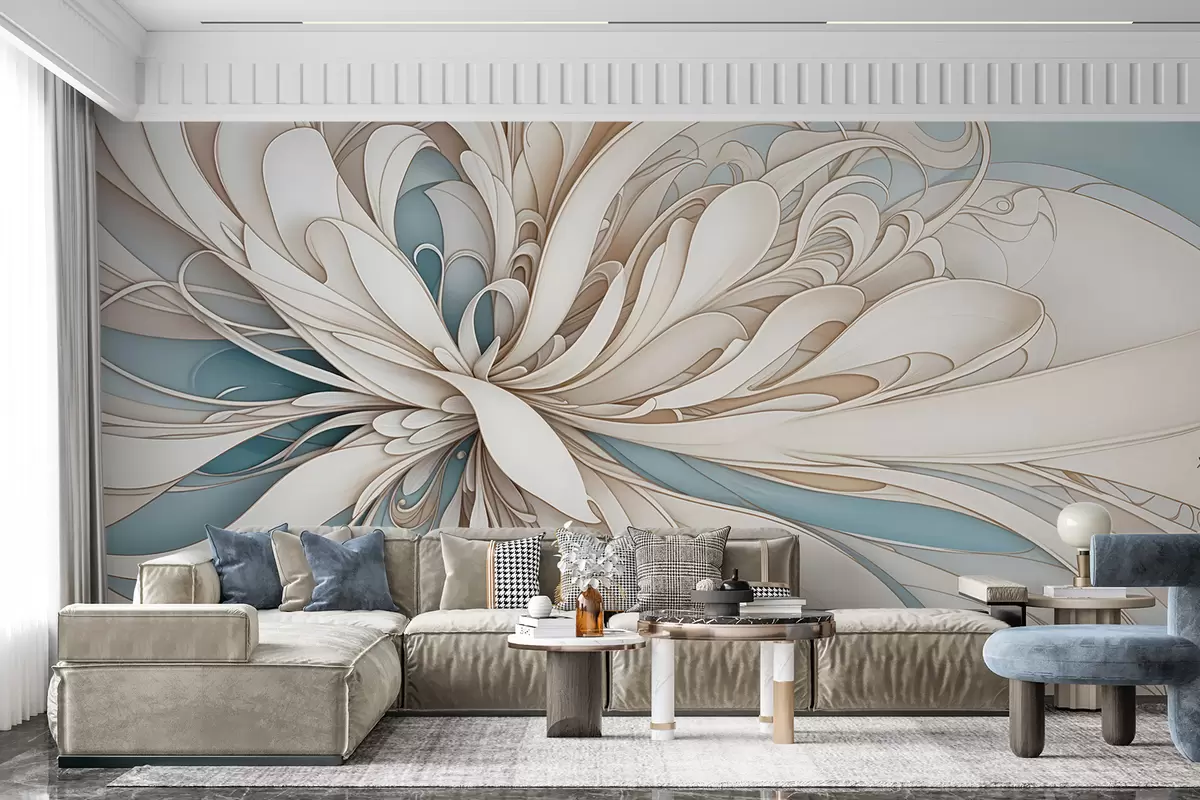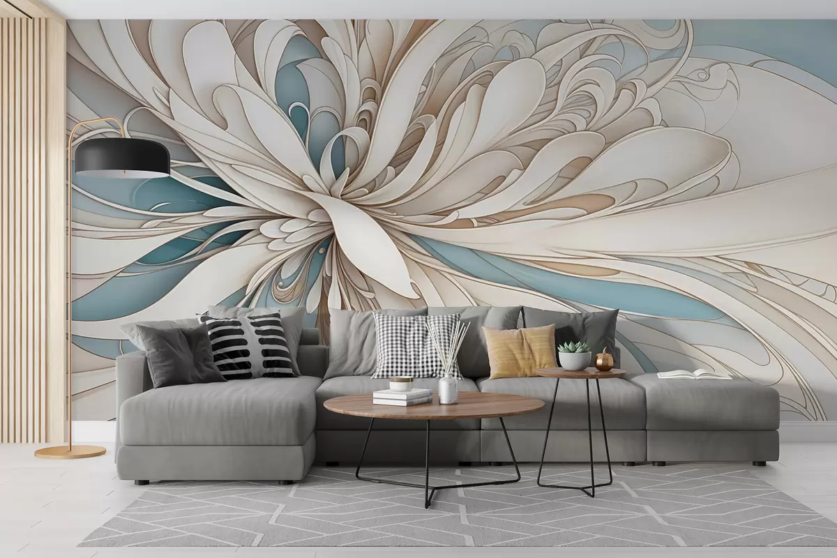Fototapeten Abstraktes florales Muster mit wirbelnden, organischen Formen in Beige-, Hellbraun- und Blautönen auf hellem Hintergrund N° w08311