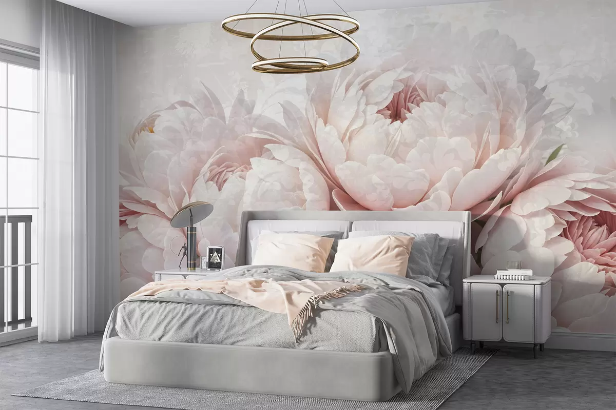 Fototapeten Zartrosa Pfingstrosen mit zarten Blütenblättern vor einem leicht strukturierten Vintage-Hintergrund N° w08312