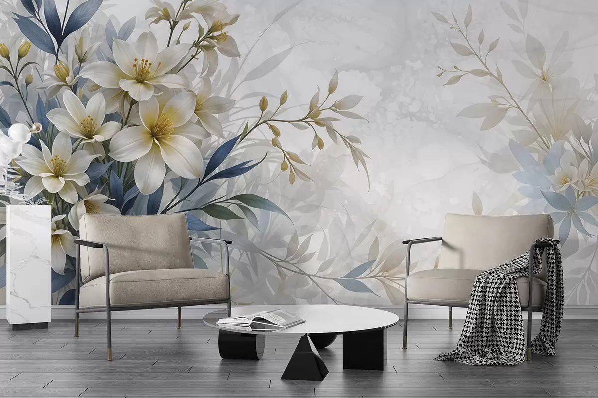 Fototapeten Weißer, beiger und blauer Blumenstrauß mit zarten Blättern auf einem weichen, unscharfen Hintergrund N° w08314