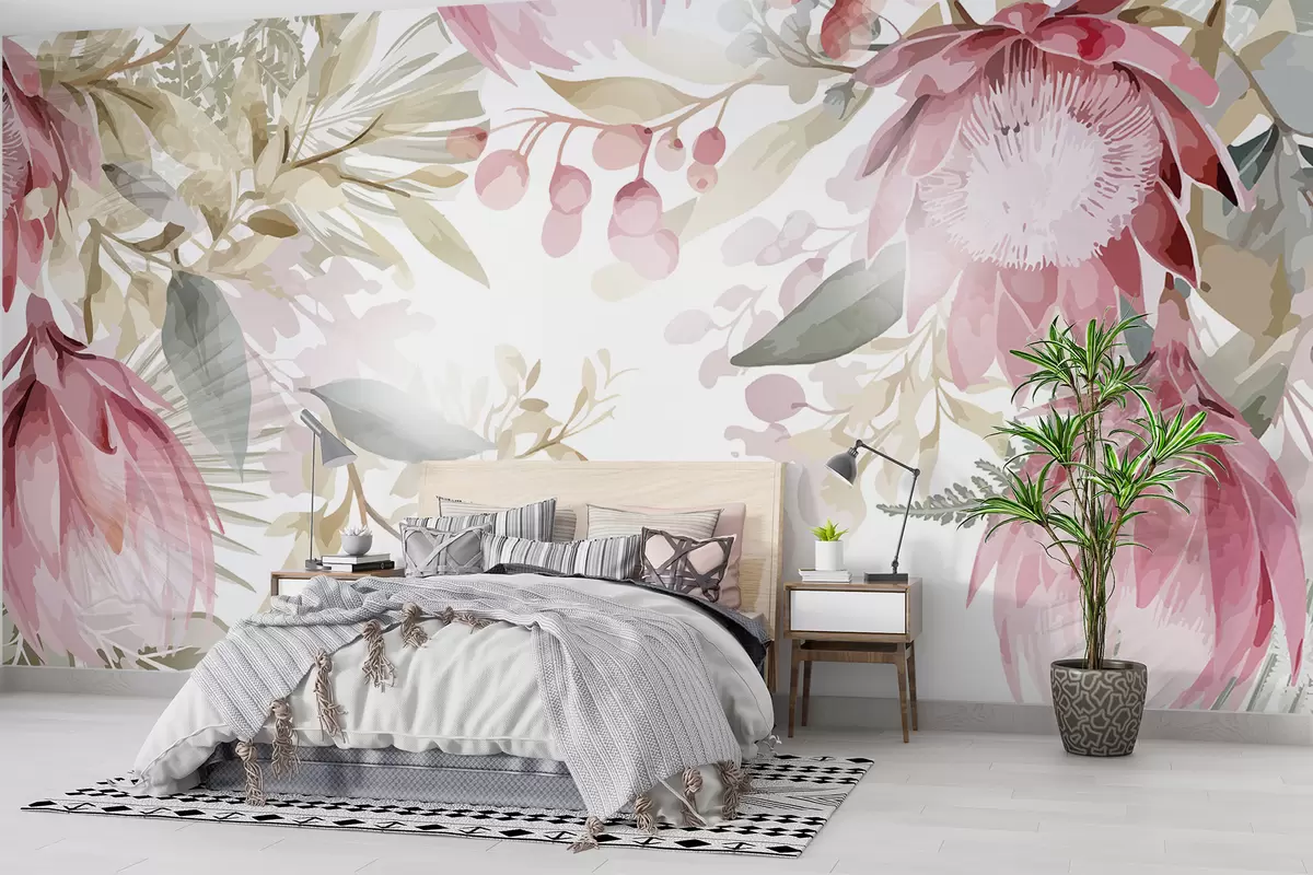 Fototapeten Große rosa und weiße transparente Proteen mit üppigen grünen Blättern vor hellem Hintergrund N° w08315