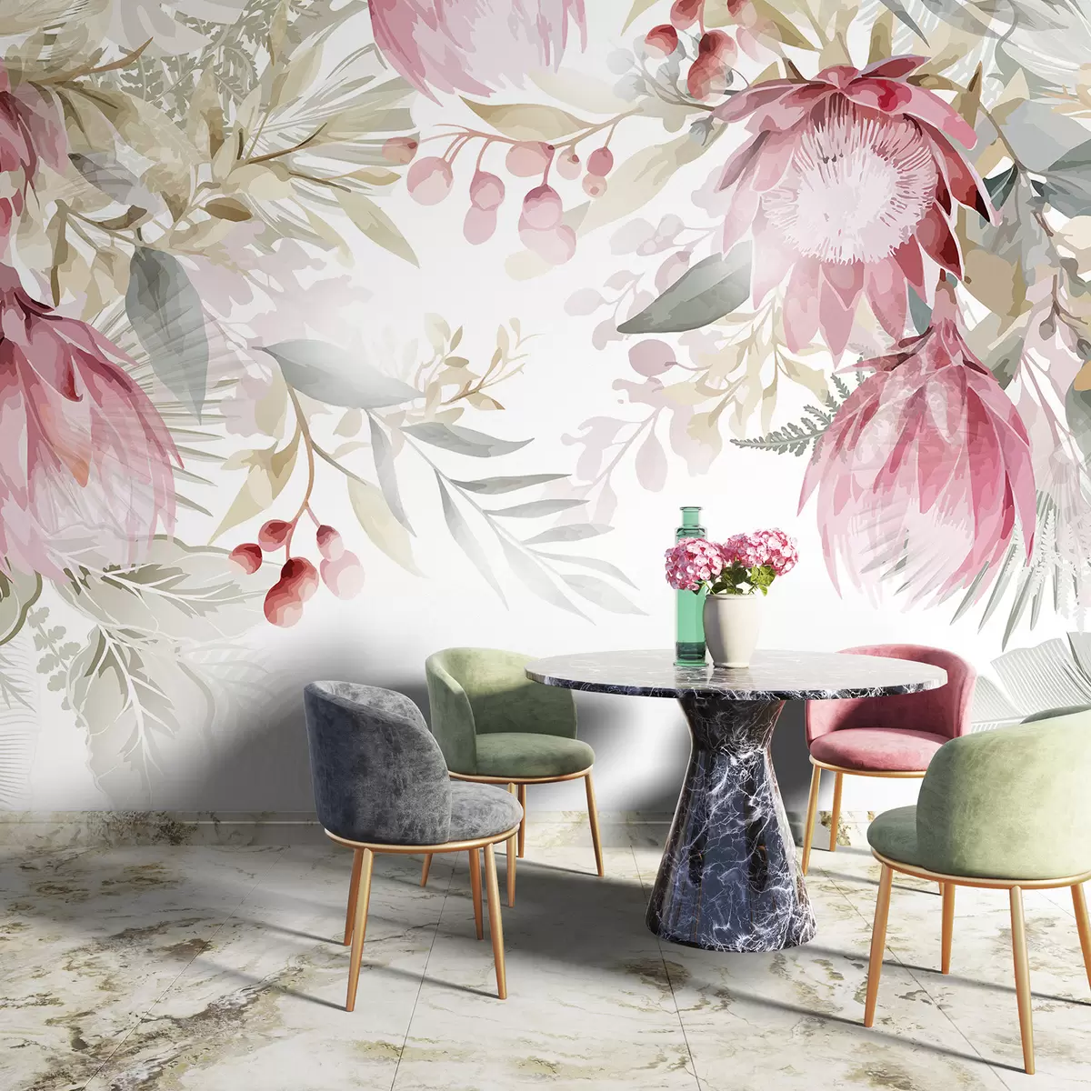 Fototapeten Große rosa und weiße transparente Proteen mit üppigen grünen Blättern vor hellem Hintergrund N° w08315