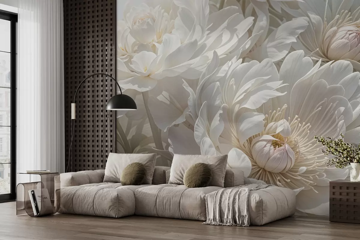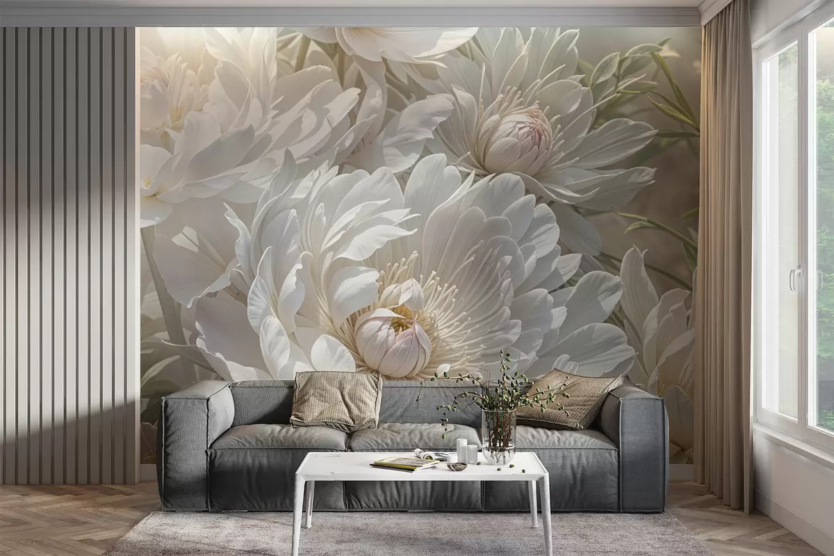 Fototapeten Eine Nahaufnahme von großen, zarten weißen Pfingstrosenblüten mit weichen, flauschigen Blütenblättern und blassgelben Zentren N° w08325