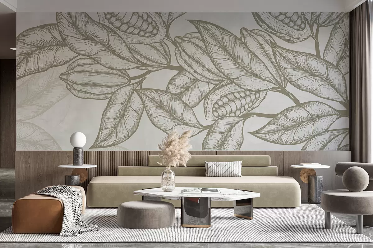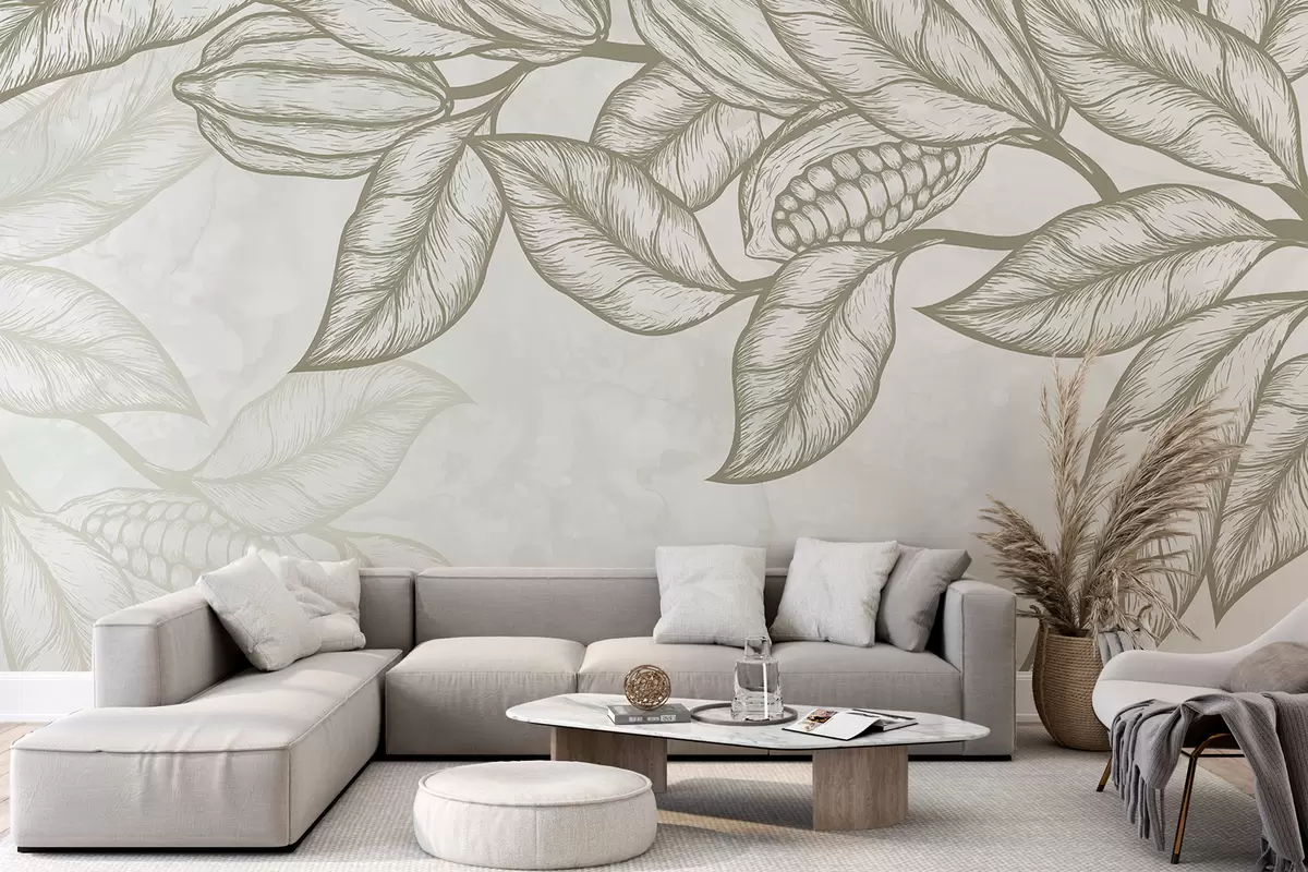Fototapeten Detaillierte Strichzeichnung von Kakaoblättern und Blattwerk in einem natürlichen, organischen Druck N° w08334