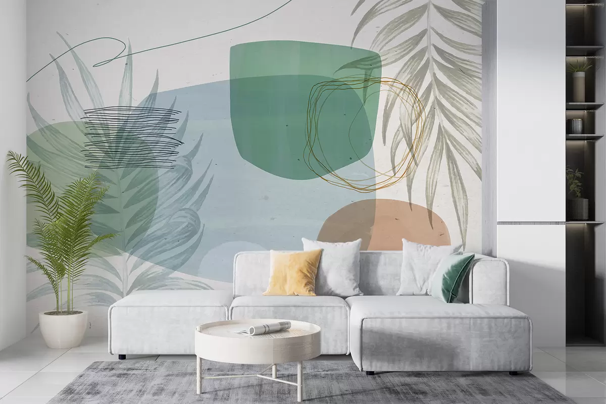 Fototapeten Abstrakte, strukturierte Komposition mit organischen Formen und tropischen Blättern, in gedämpften Pastellfarben N° w08335
