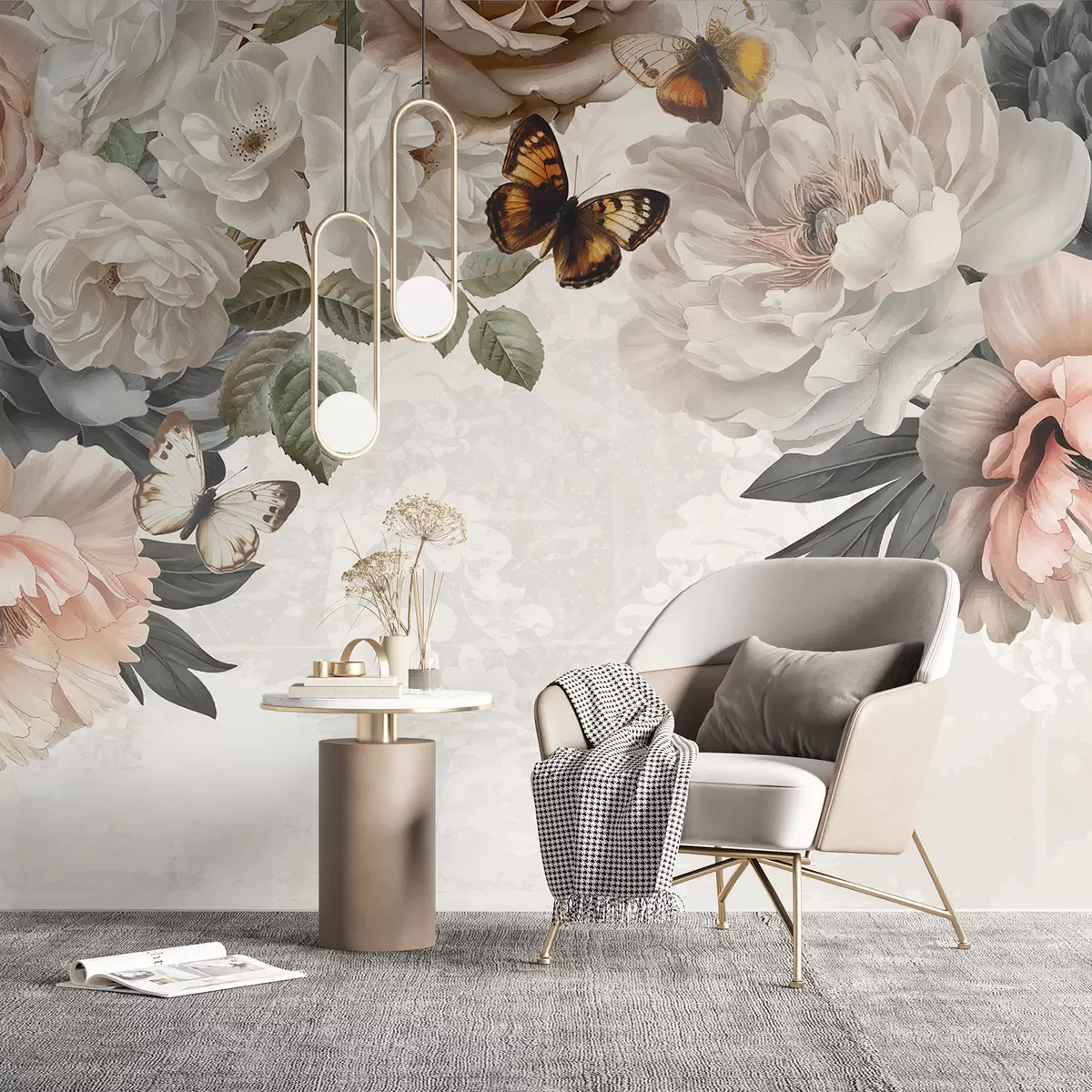 Fototapeten Große weiße und rosafarbene Pfingstrosenblüten mit einem Schmetterling, der auf einer der Blüten sitzt, vor einem weichen, unscharfen Hintergrund N° w08340