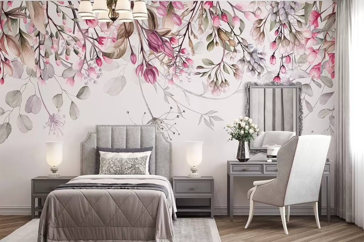 Fototapeten Zarte rosa und weiße Blütenzweige mit Blättern und Blütenblättern, auf pastellgrauem Hintergrund N° w08347