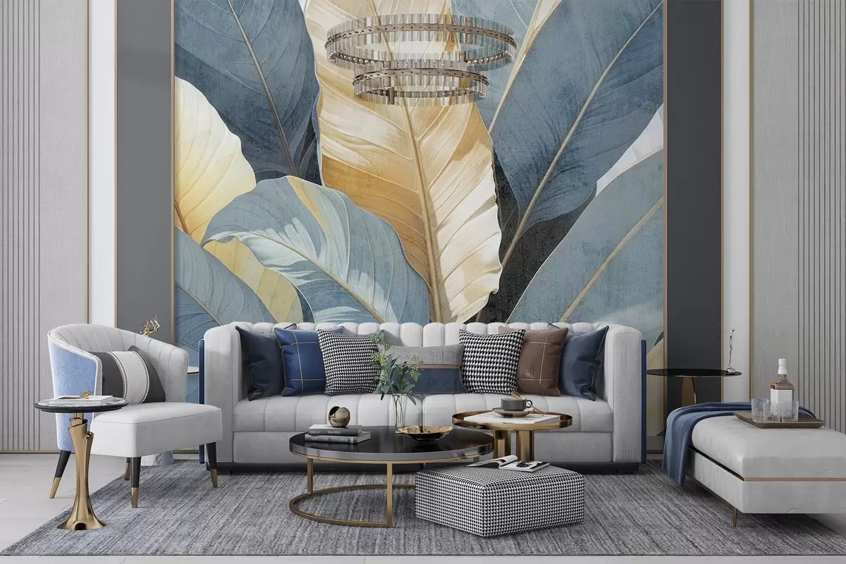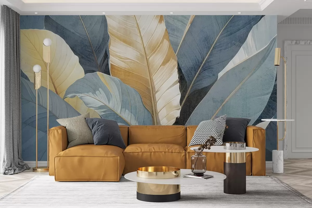 Fototapeten Eine Nahaufnahme von großen, üppigen, strukturierten, dekorativen tropischen Blättern in Blau-, Grün- und Gelbtönen N° w08373