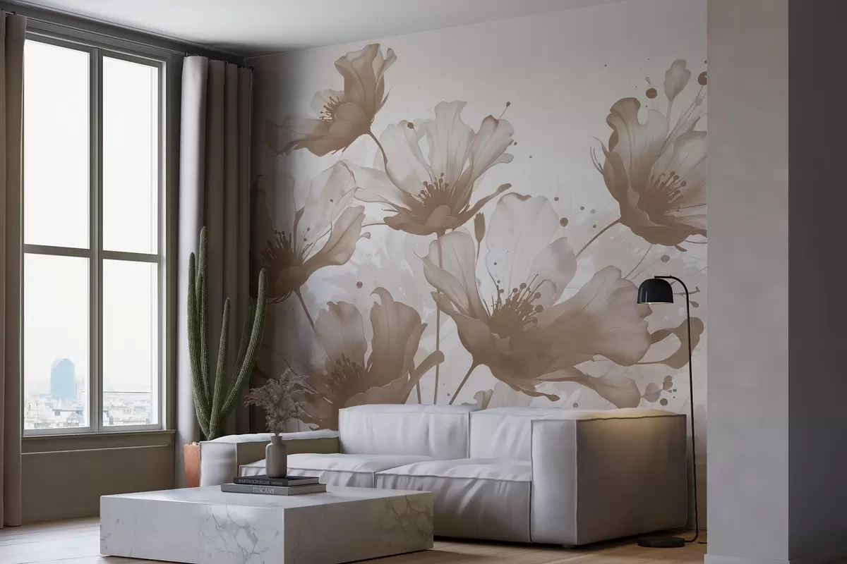 Fototapeten Zarte braune Blumen mit weichen, verschwommenen Blütenblättern und Aquarellspritzern vor hellem Hintergrund N° w08376v1
