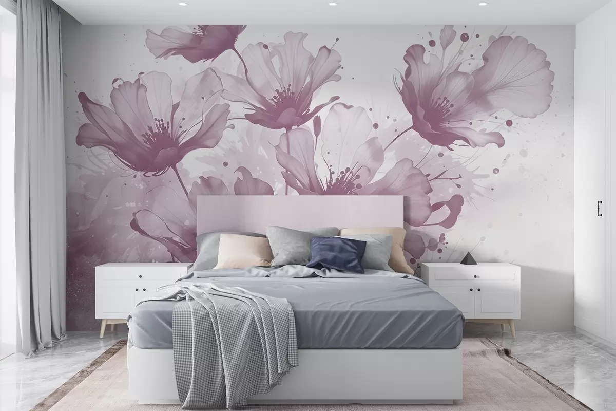 Fototapeten Zarte rosa Blumen mit weichen, verschwommenen Blütenblättern und Aquarellspritzern vor hellem Hintergrund N° w08376v2