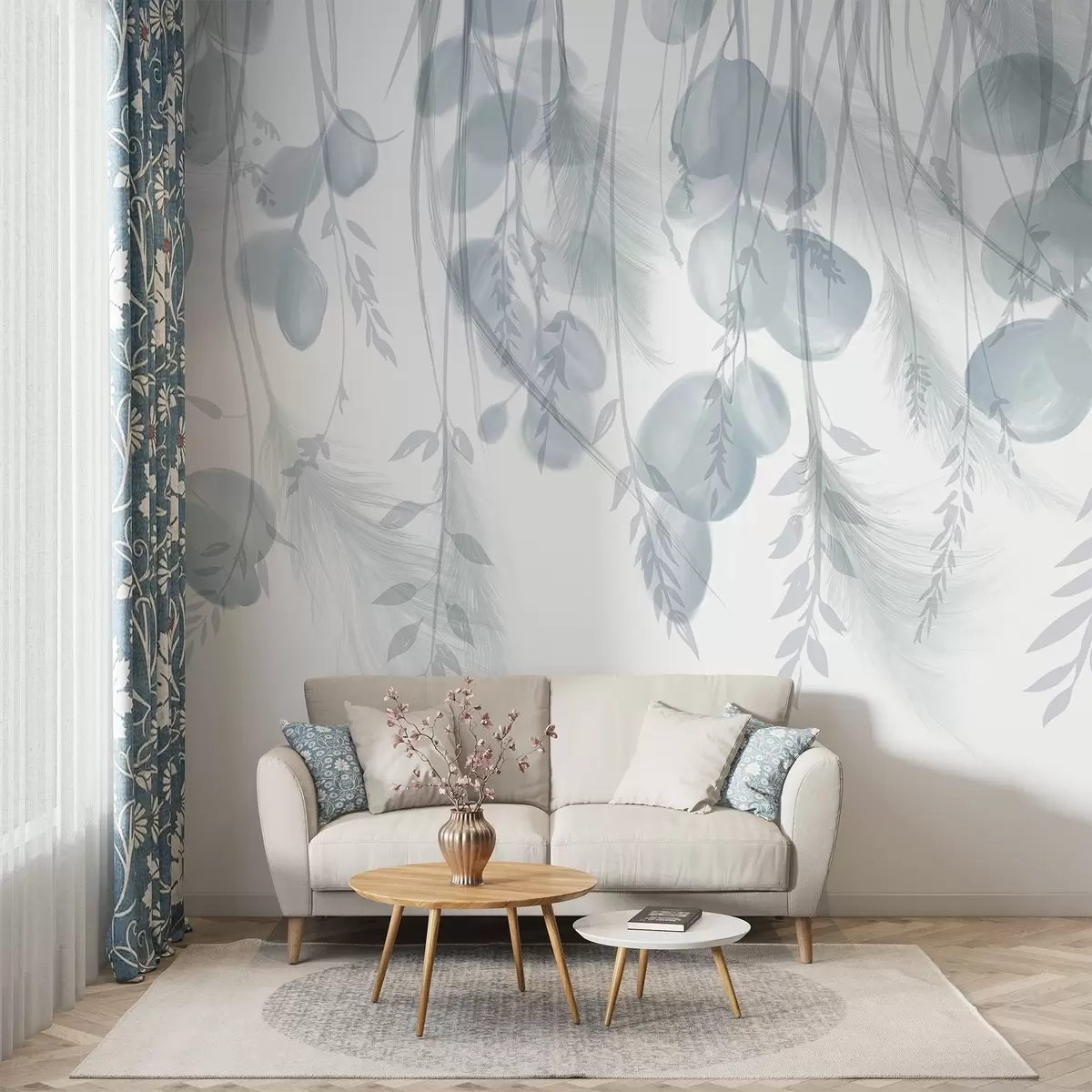 Fototapeten Zarte graue und pastellgrüne Eukalyptusblätter fallen und schaffen eine heitere und beruhigende Atmosphäre N° w08380