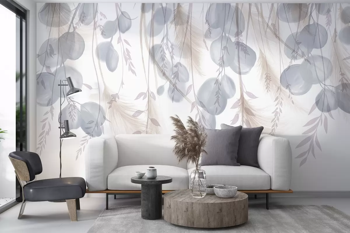 Fototapeten Zarte blaue und pastellbeige Eukalyptusblätter fallen und schaffen eine heitere und beruhigende Atmosphäre N° w08380v1