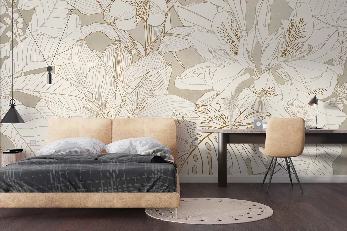Fototapeten Detaillierter pastellgelber Blumendruck mit verschiedenen Arten von Blumen und Blättern, ein üppiges, kompliziertes botanisches Design N° w08385v1
