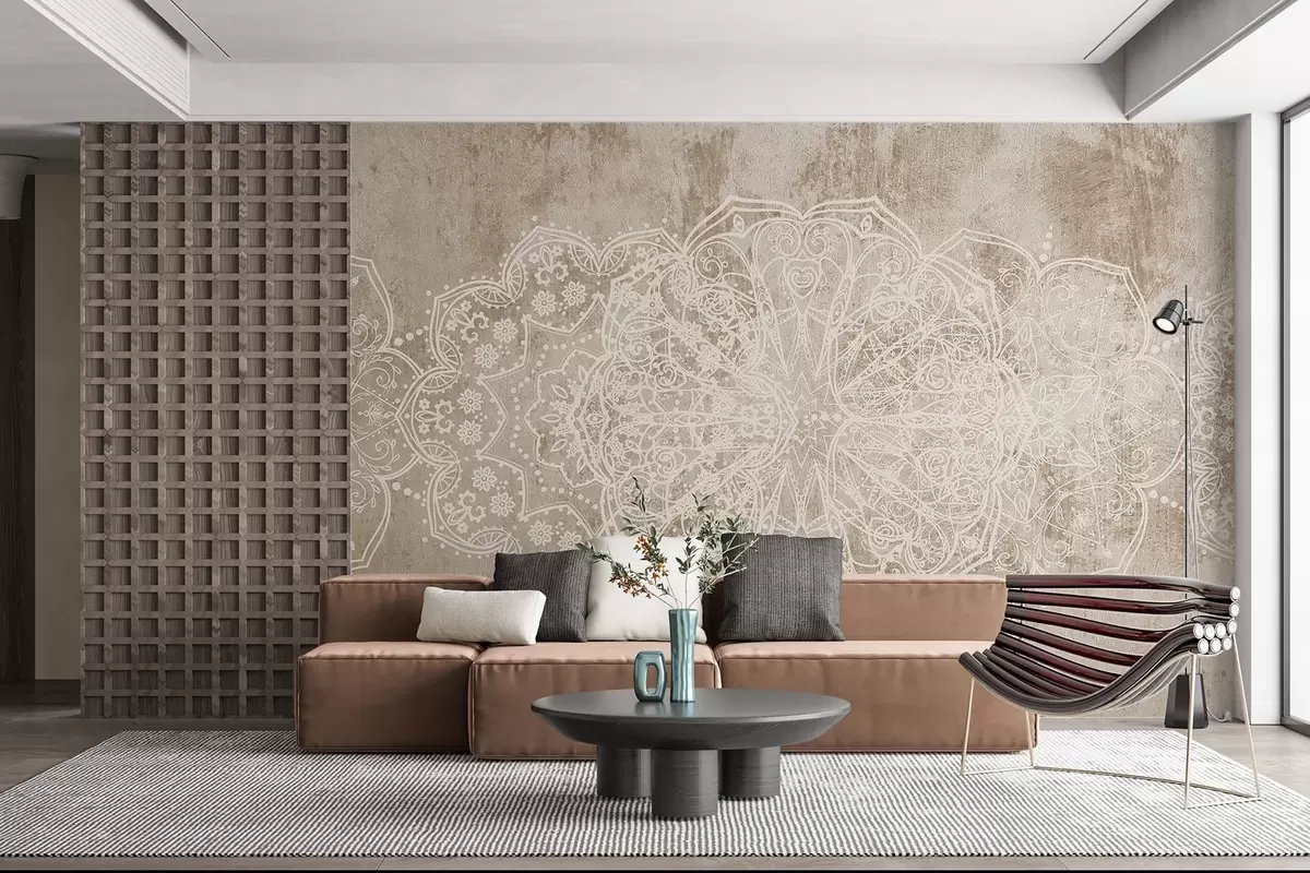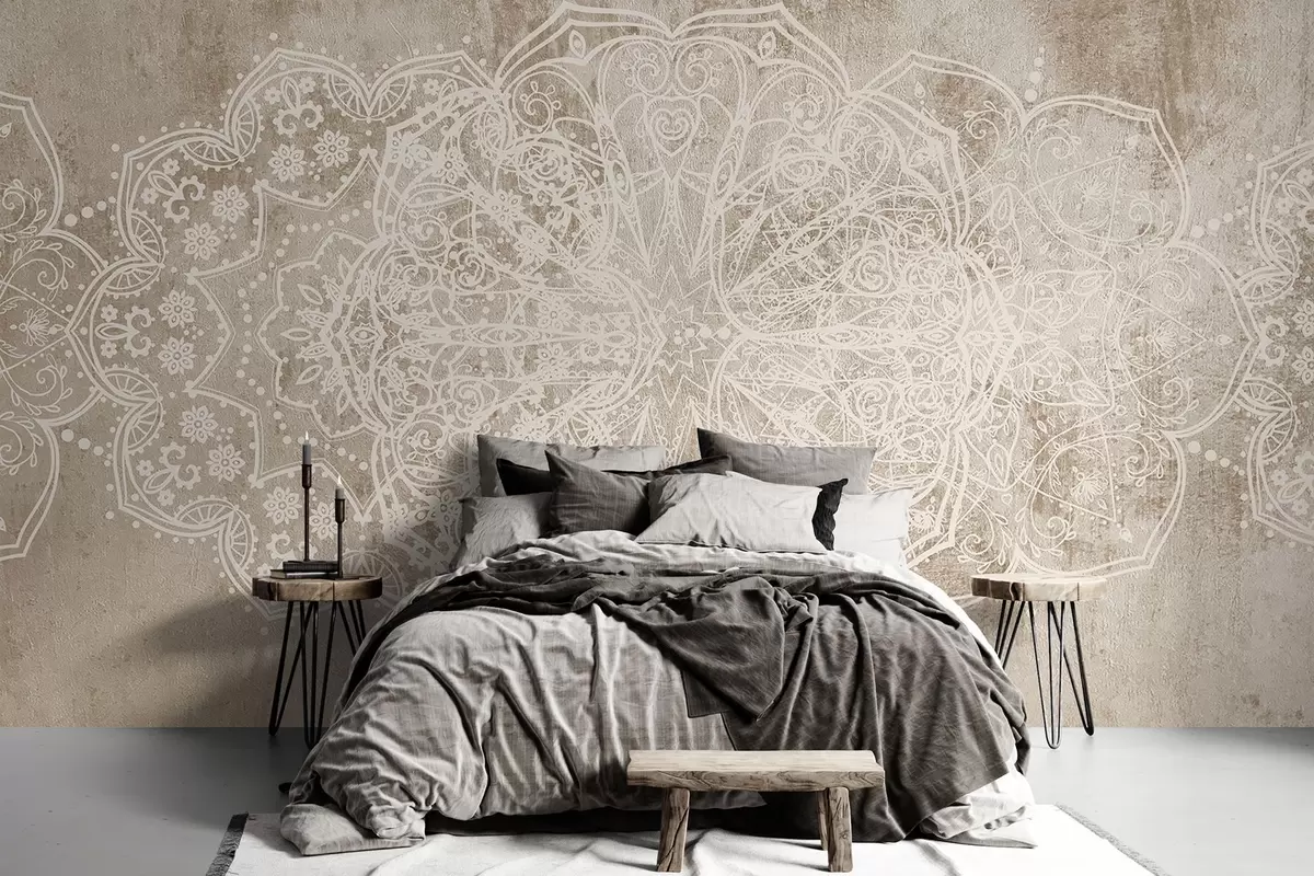 Fototapeten Ein detailliertes, kompliziertes weißes Spitzenmandala-Muster auf einem strukturierten beige-braunen Loft-Wandhintergrund N° w08387v1