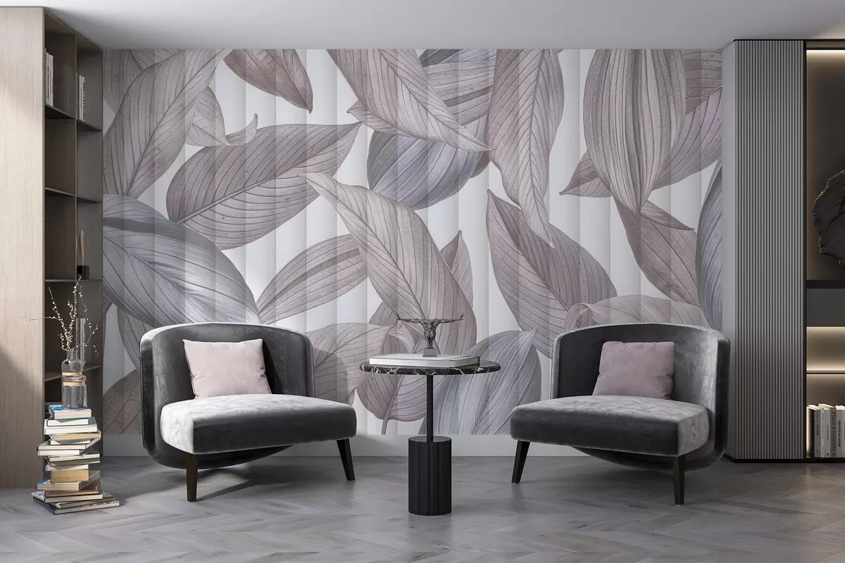 Fototapeten Abstrakte detaillierte Blätter in Schattierungen von Blau, Grau und Pastellrosa auf hellem Hintergrund N° w08388v1