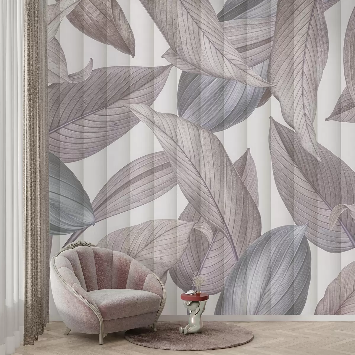 Fototapeten Abstrakte detaillierte Blätter in Schattierungen von Blau, Grau und Pastellrosa auf hellem Hintergrund N° w08388v1