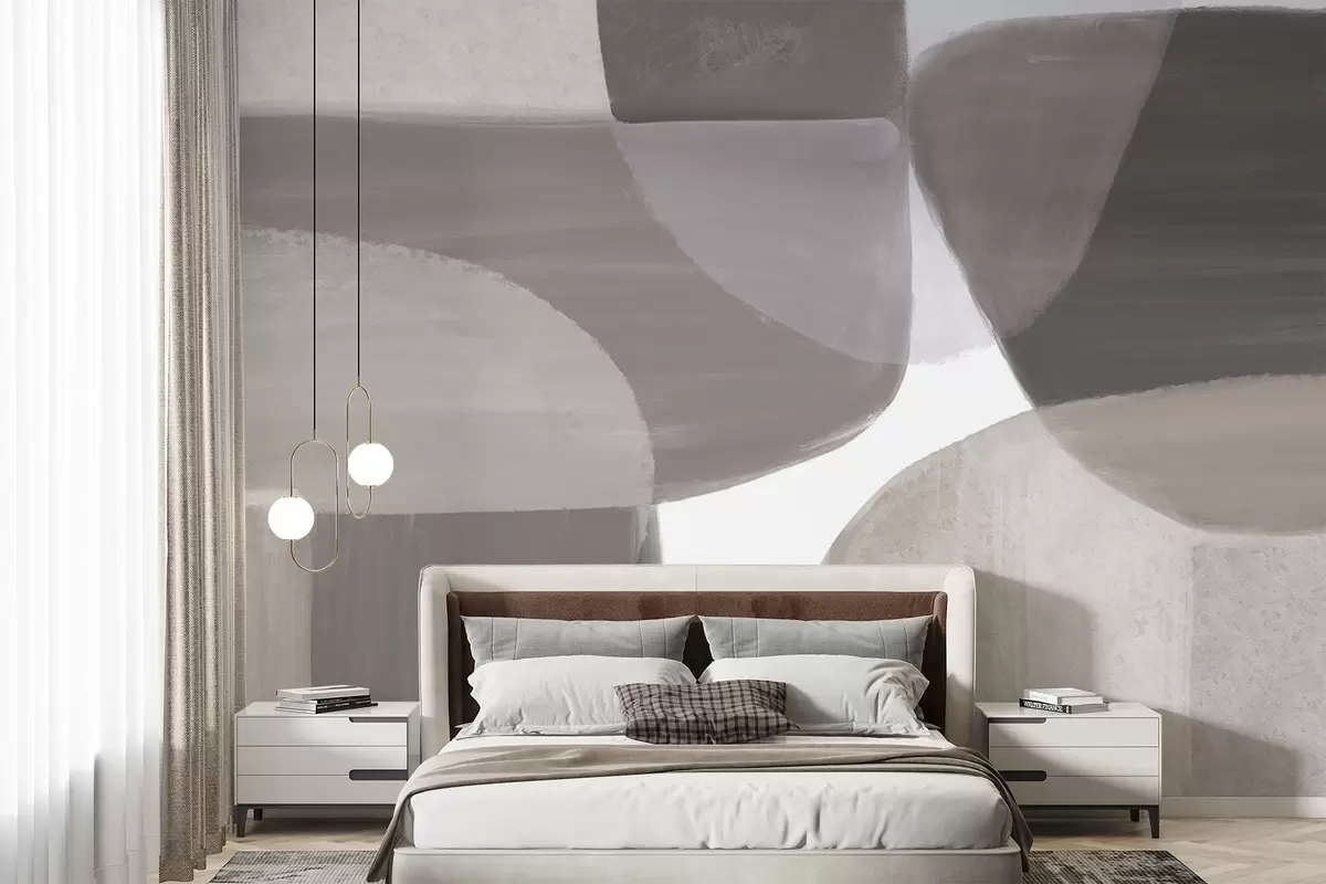 Fototapeten Ein monochromer abstrakter Druck mit sich überschneidenden minimalistischen Formen in Grau- und Beigetönen N° w08410v1