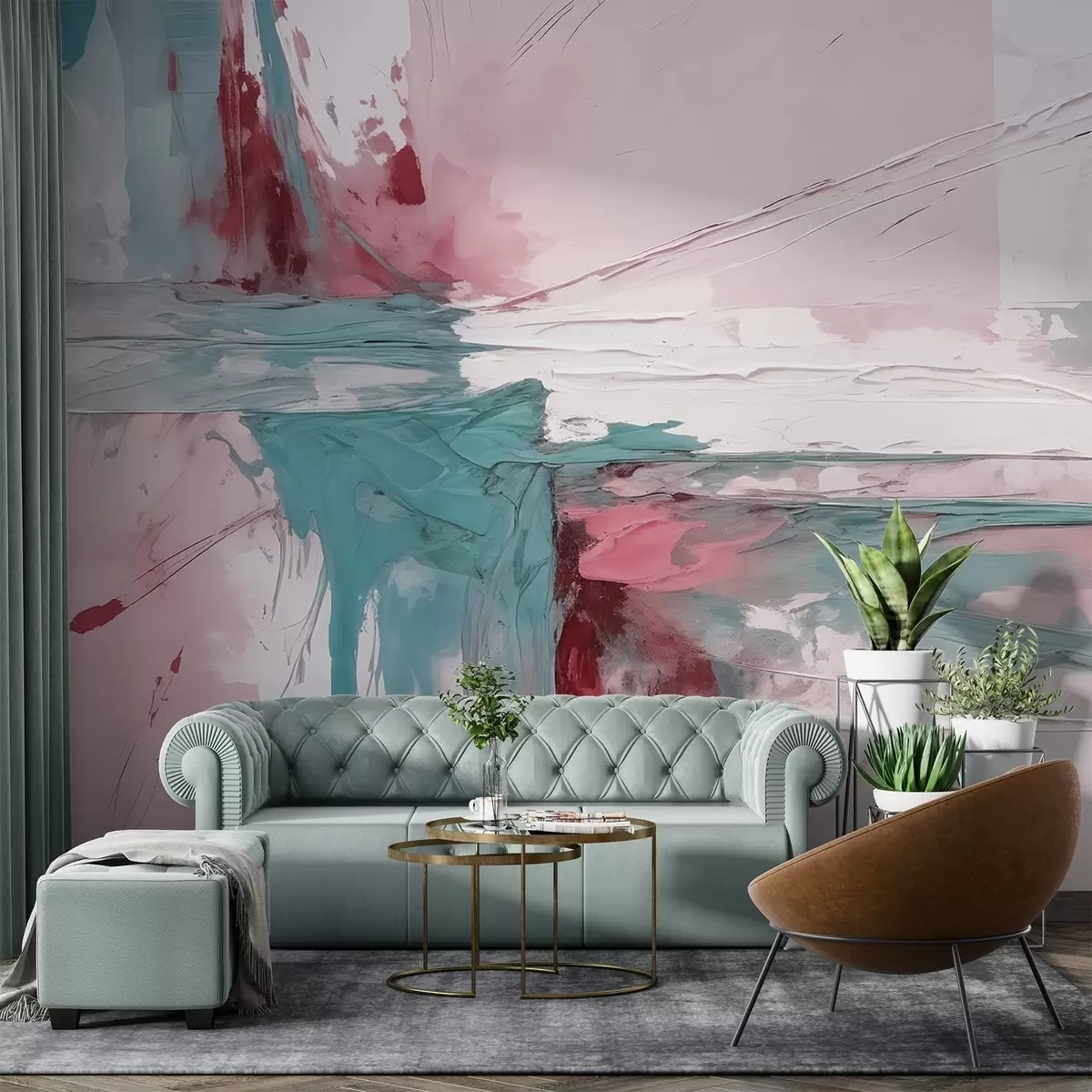 Fototapeten Minimalistische abstrakte Kunst Komposition mit fetten Pinselstrichen von rosa, blau und weißer Farbe N° w08414v1