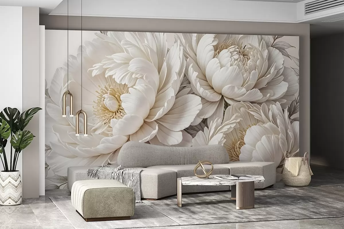 Fototapeten Zarte pastellweiße Pfingstrosen mit üppigem Blattwerk vor einem weichen, neutralen Hintergrund N° w08420