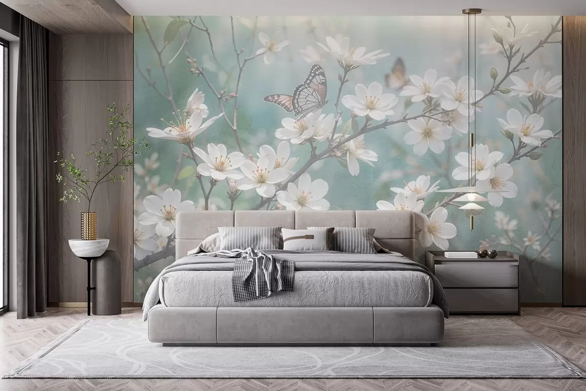 Fototapeten Ein weißer Schmetterling auf einem Zweig mit zarten weißen Kirschblüten im Vordergrund vor einem unscharfen Hintergrund N° w08421