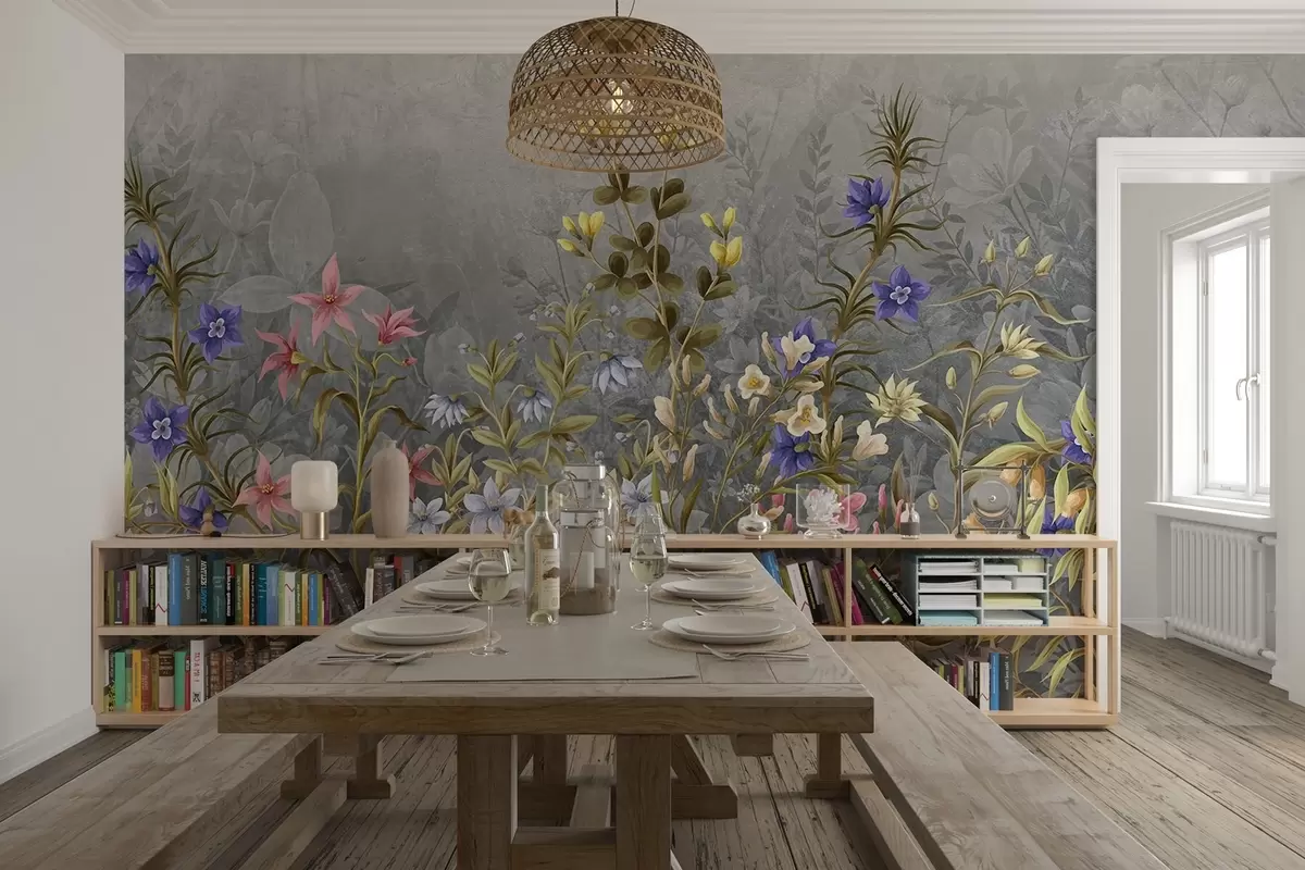 Fototapeten Ein üppiger, lebendiger Blumen-Strukturdruck mit bunten Blumen und Pflanzen mit komplizierten Details und Texturen N° w08428v1