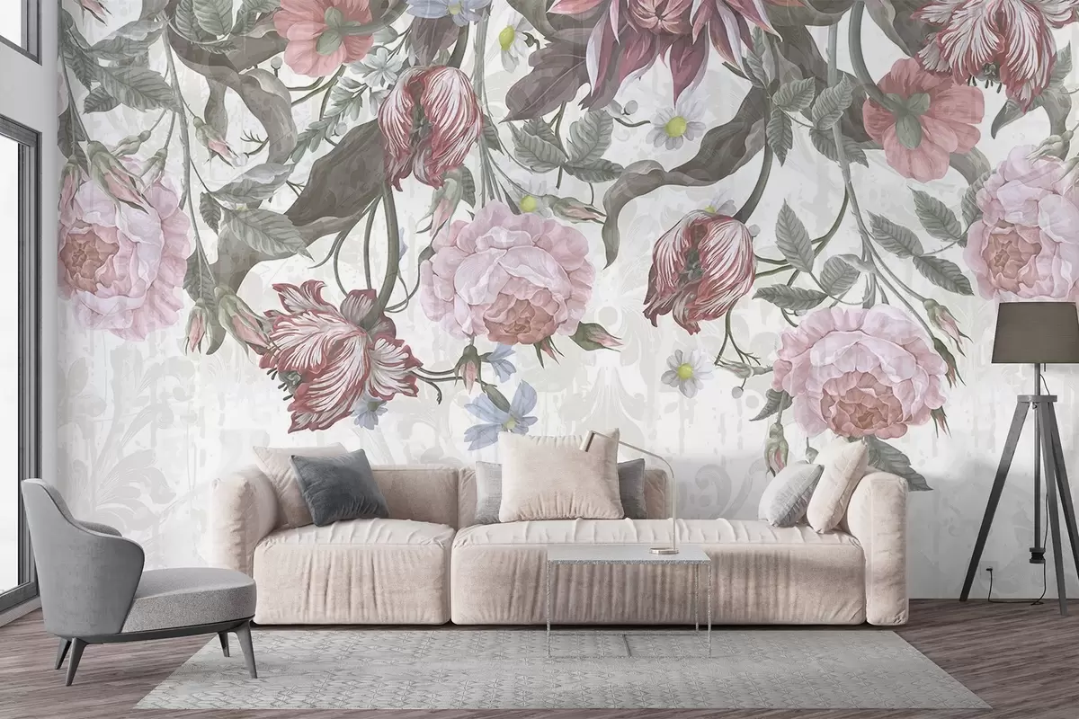 Fototapeten Ein üppiges Blumenarrangement mit großen rosa und weißen Blüten, grünen Blättern und Stielen N° w08435