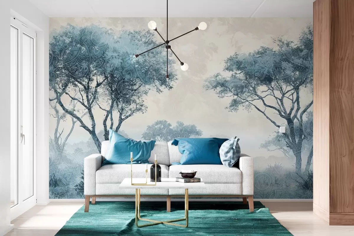 Fototapeten Eine neblige, heitere Landschaft mit silhouettierten Bäumen im Vordergrund und weichem Nebel in Blau- und Beigetönen N° w08442