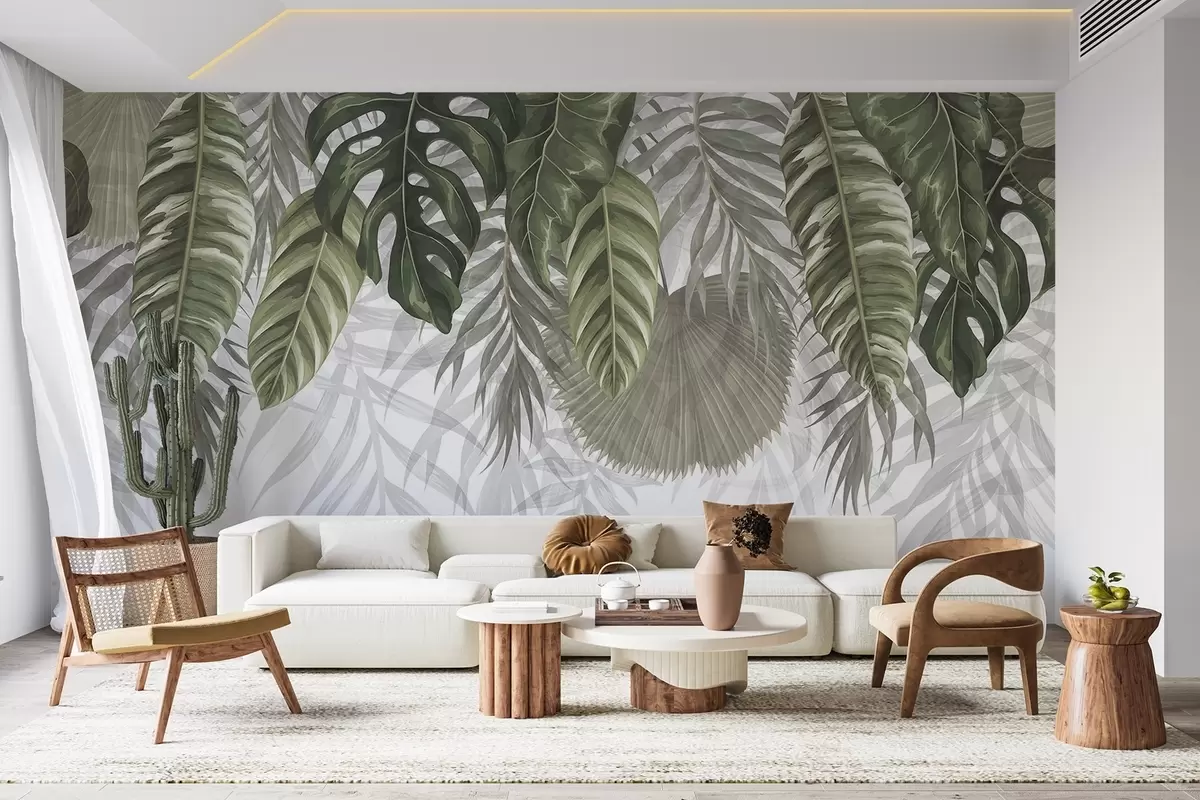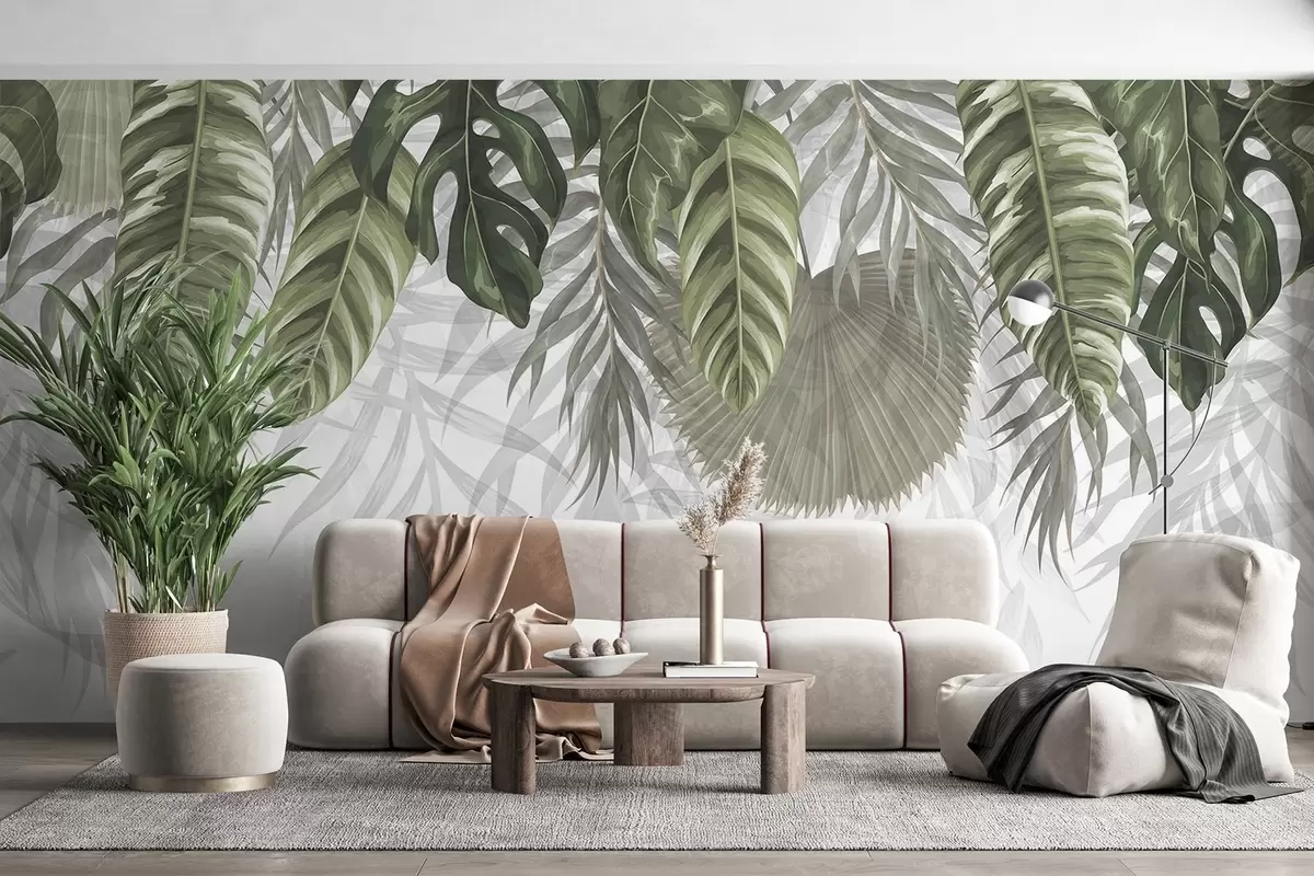 Fototapeten Tropische Blätter in Grüntönen, darunter große Monstera-Blätter und Palmwedel auf weißem Hintergrund N° w08443