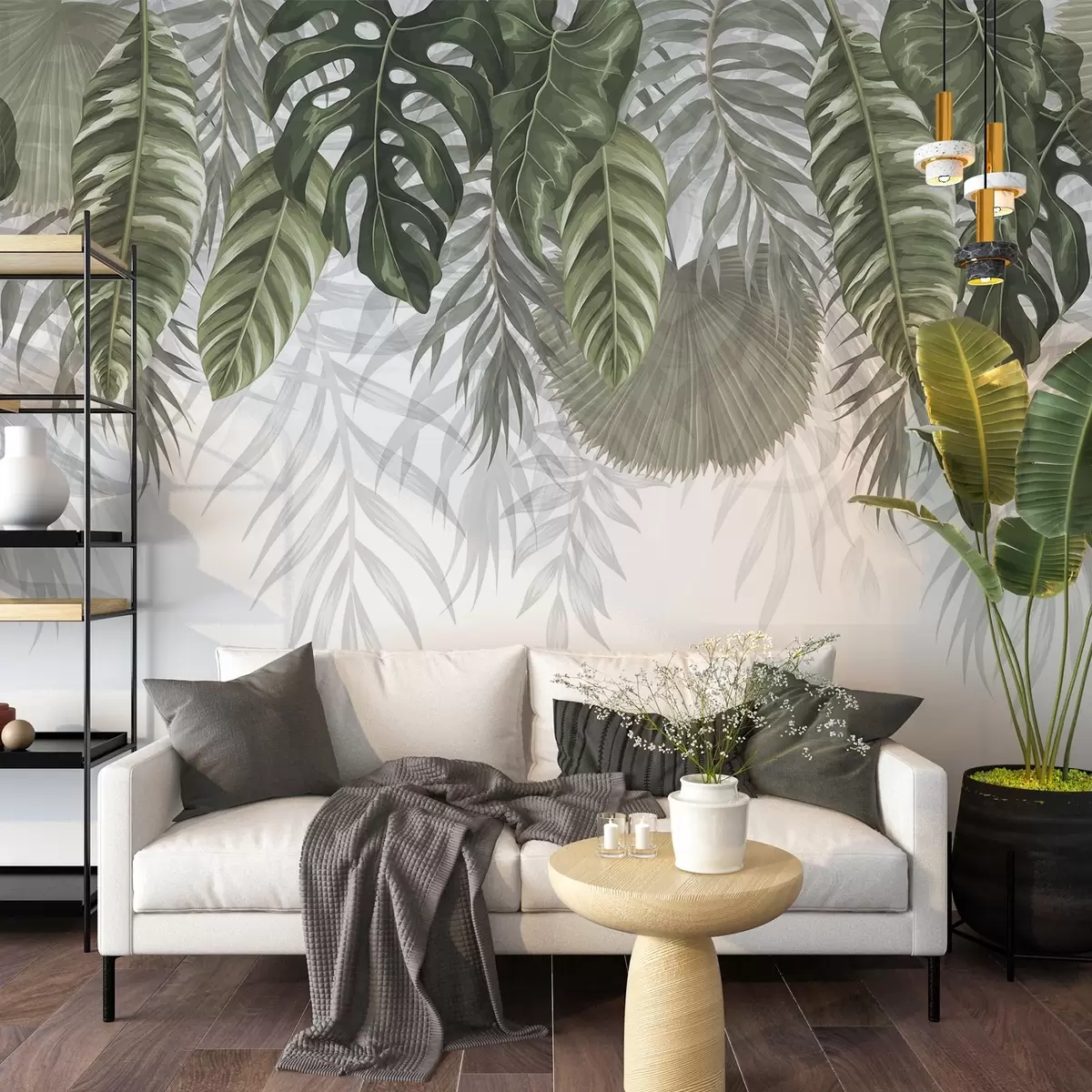 Fototapeten Tropische Blätter in Grüntönen, darunter große Monstera-Blätter und Palmwedel auf weißem Hintergrund N° w08443