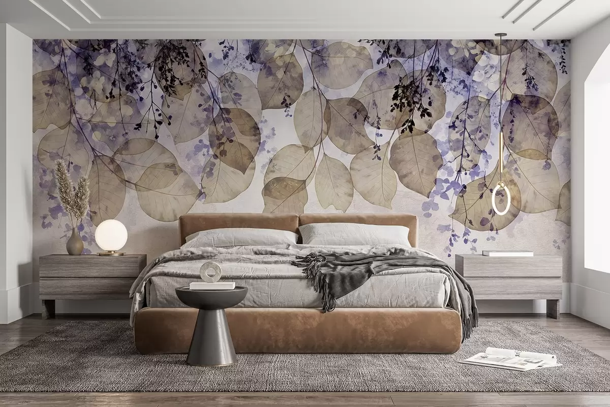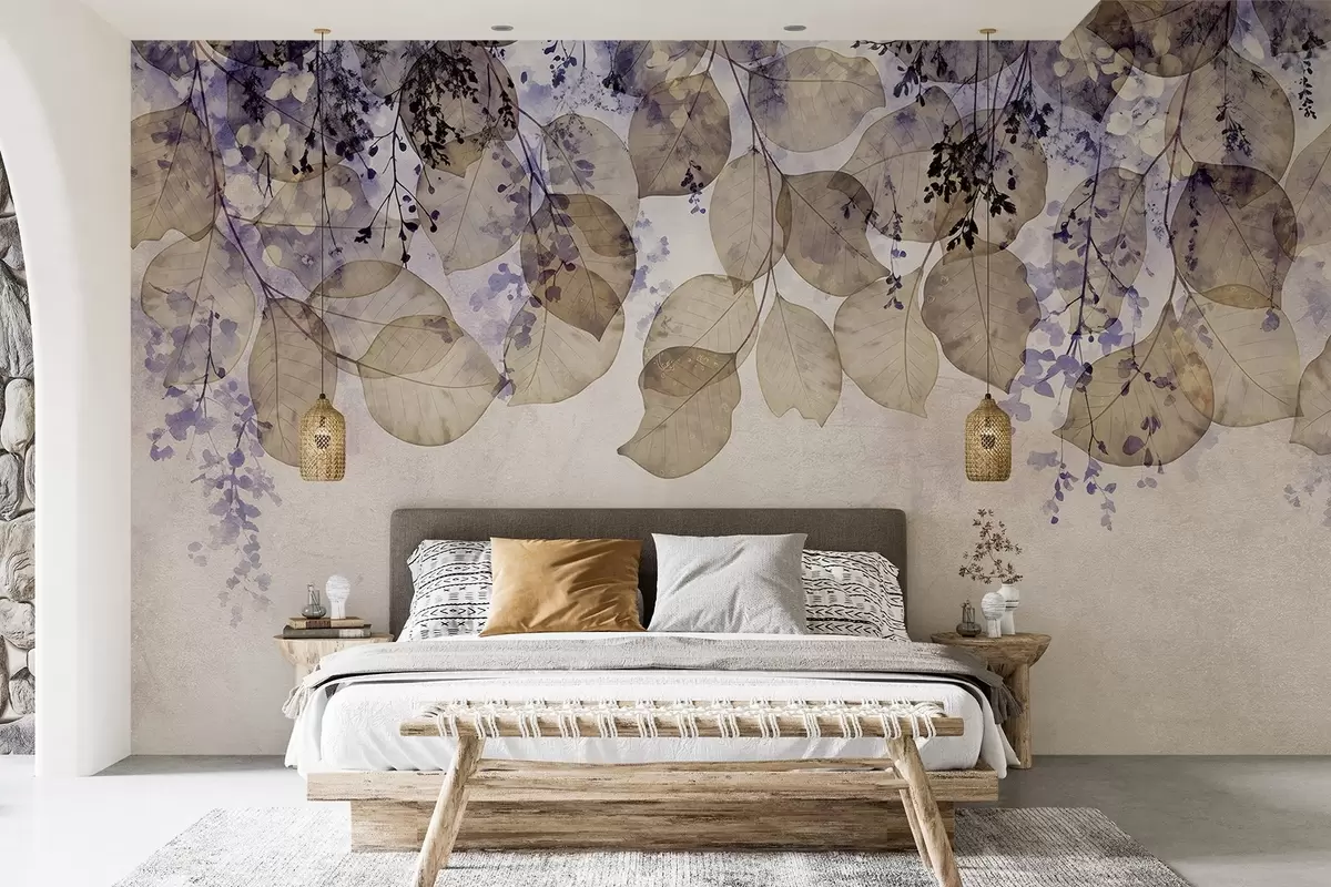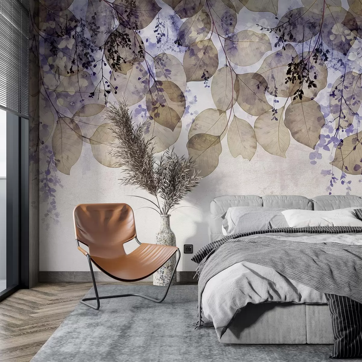 Fototapeten Zarte getrocknete Blätter und Blumen in Violett-, Beige- und Weißtönen vor einem hellen, strukturierten Hintergrund N° w08447
