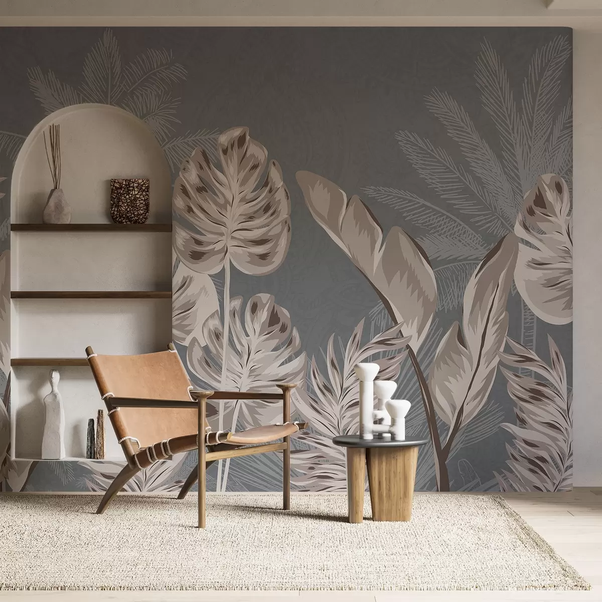 Fototapeten Große, zarte beigefarbene Blätter vor einem gedämpften grauen Hintergrund, die eine heitere und ätherische Atmosphäre schaffen N° w08449