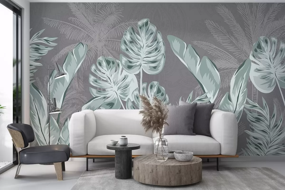 Fototapeten Große, zarte blaugrüne Blätter vor einem gedämpften grauen Hintergrund, die eine ruhige und ätherische Atmosphäre schaffen N° w08449v1