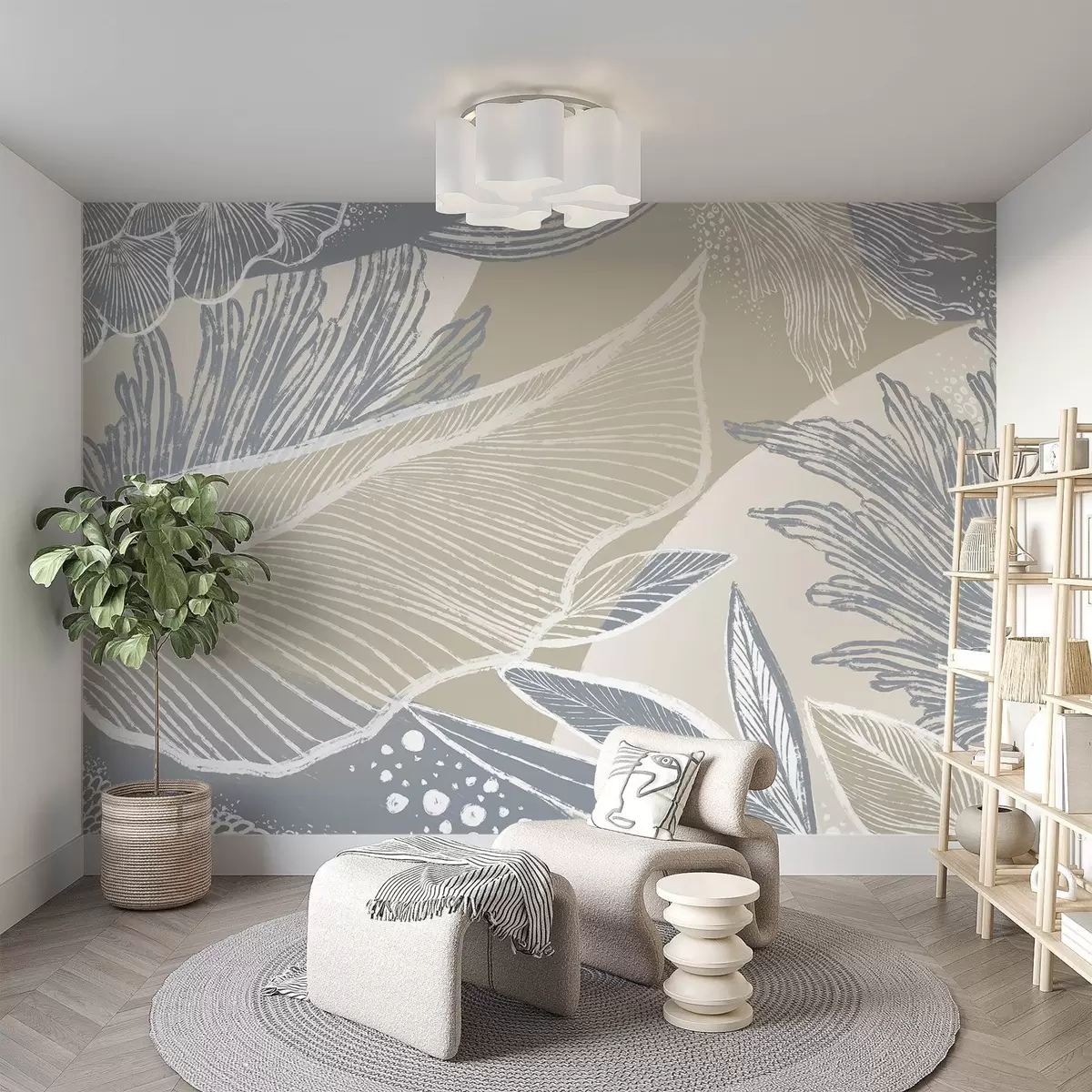 Fototapeten Pastellblauer und weißer abstrakter Druck mit organischen Formen und Linien in gedämpfter Farbpalette N° w08450