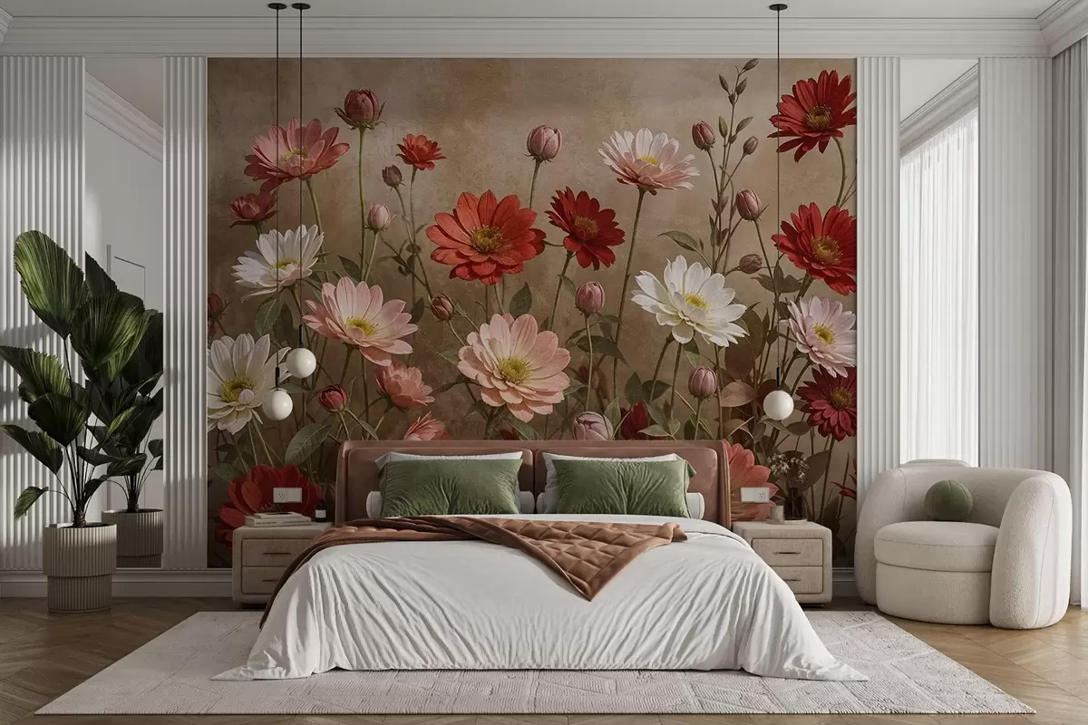 Fototapeten Ein Feld von bunten Gänseblümchen wie Blumen in verschiedenen Schattierungen von rosa, rot und weiß vor einem strukturierten Hintergrund N° w08462