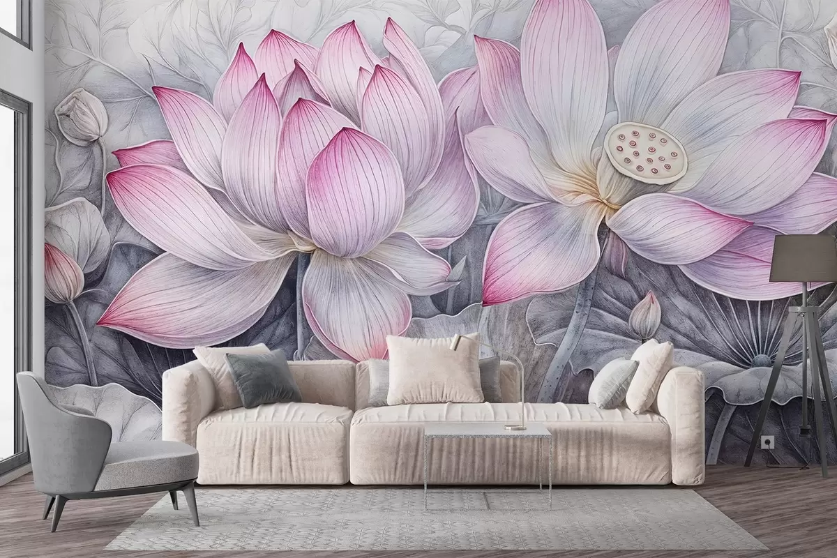 Fototapeten Mehrere detailliert strukturierte große rosa Lotusblumen mit grau-grünen Blättern und Stängeln vor hellem Hintergrund N° w08465
