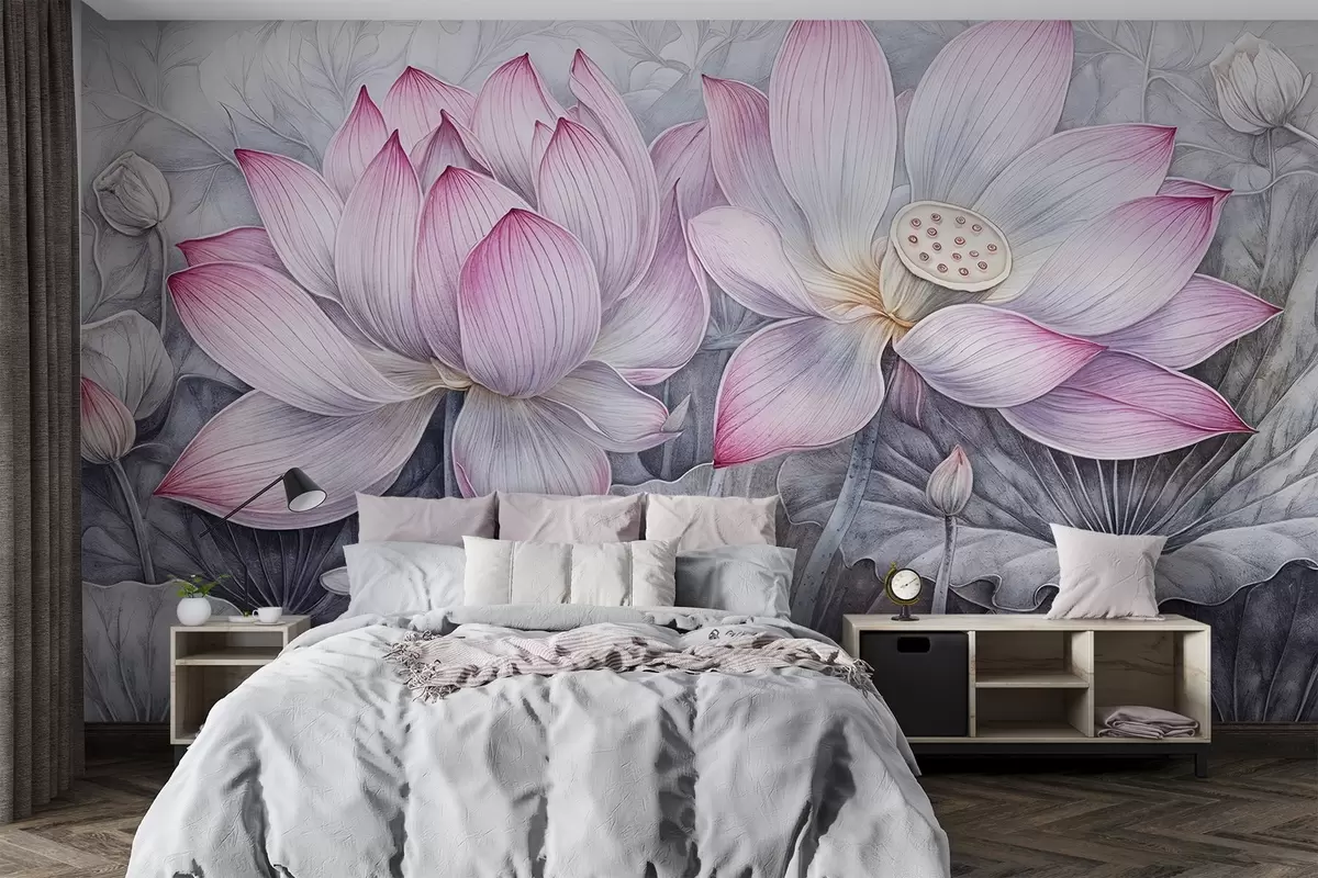 Fototapeten Mehrere detailliert strukturierte große rosa Lotusblumen mit grau-grünen Blättern und Stängeln vor hellem Hintergrund N° w08465
