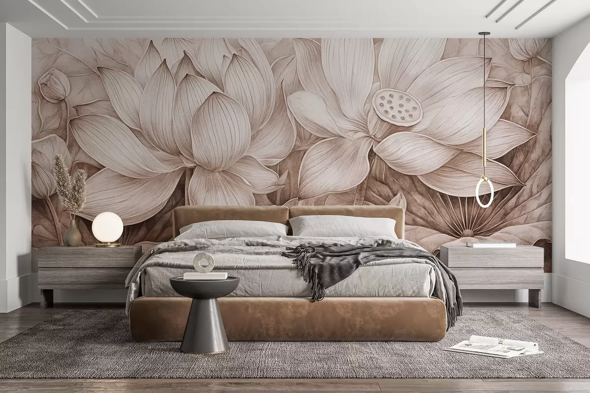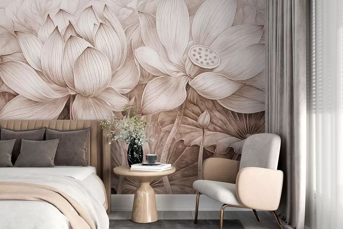 Fototapeten Mehrere detailliert strukturierte große beigefarbene Lotusblumen mit braunen Blättern und Stängeln vor hellem Hintergrund N° w08465v1